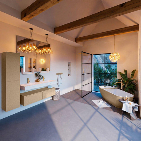 De MONDIAZ ALAN - DLUX Badkamermeubelset is ontworpen met oog voor stijl. Het Oro kleurenschema geeft een warme en luxe uitstraling aan de badkamer. De vrijhangende wastafel met 2 wasbakken biedt niet alleen voldoende ruimte voor dagelijks gebruik, maar zorgt ook voor een moderne en strakke look. De 2 lades zorgen voor opbergruimte zonder in te leveren op design, waardoor functionaliteit en esthetiek hand in hand gaan.