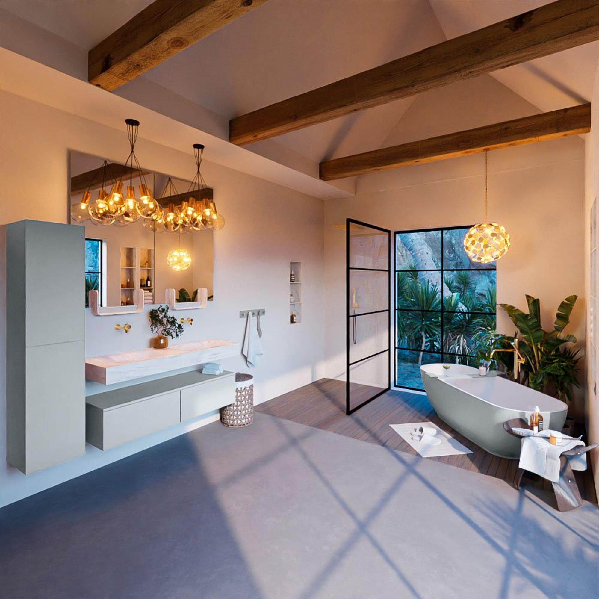 Dit badkamermeubel onderscheidt zich door zijn stijlvolle ontwerp en verfijnde details. De combinatie van de Clay kleur en de vrijhangende wastafel met 2 wasbakken creëert een elegante uitstraling. De 2 lades bieden niet alleen praktische opbergruimte, maar dragen ook bij aan de esthetiek van het geheel. Met de MONDIAZ ALAN - DLUX Badkamermeubelset voeg je een vleugje luxe toe aan je badkamer.