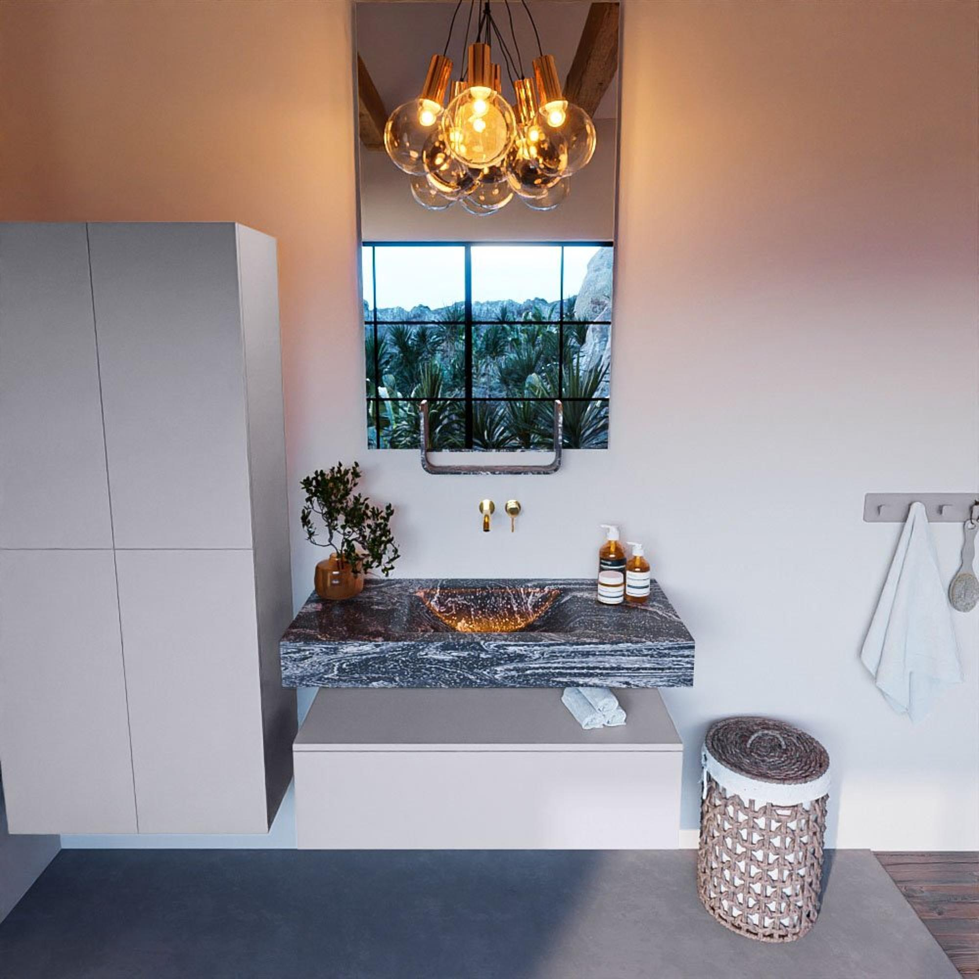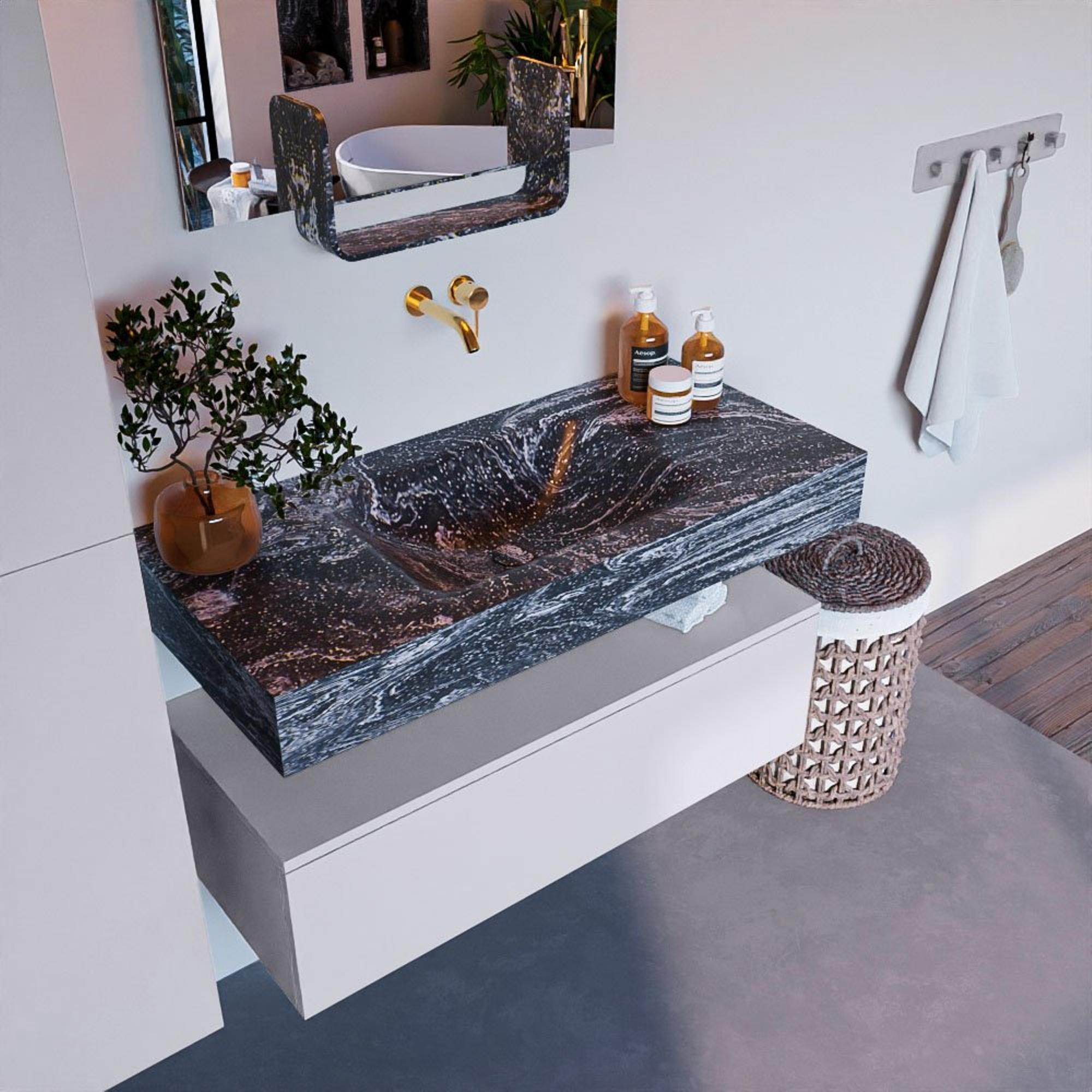 De Lava afwerking van de MONDIAZ ALAN - DLUX Badkamermeubelset geeft een luxueuze uitstraling aan de badkamer. De diepe, rijke kleur voegt warmte en elegantie toe aan de ruimte. Dit meubelstuk is een perfecte keuze voor wie op zoek is naar een vleugje luxe in de badkamer.