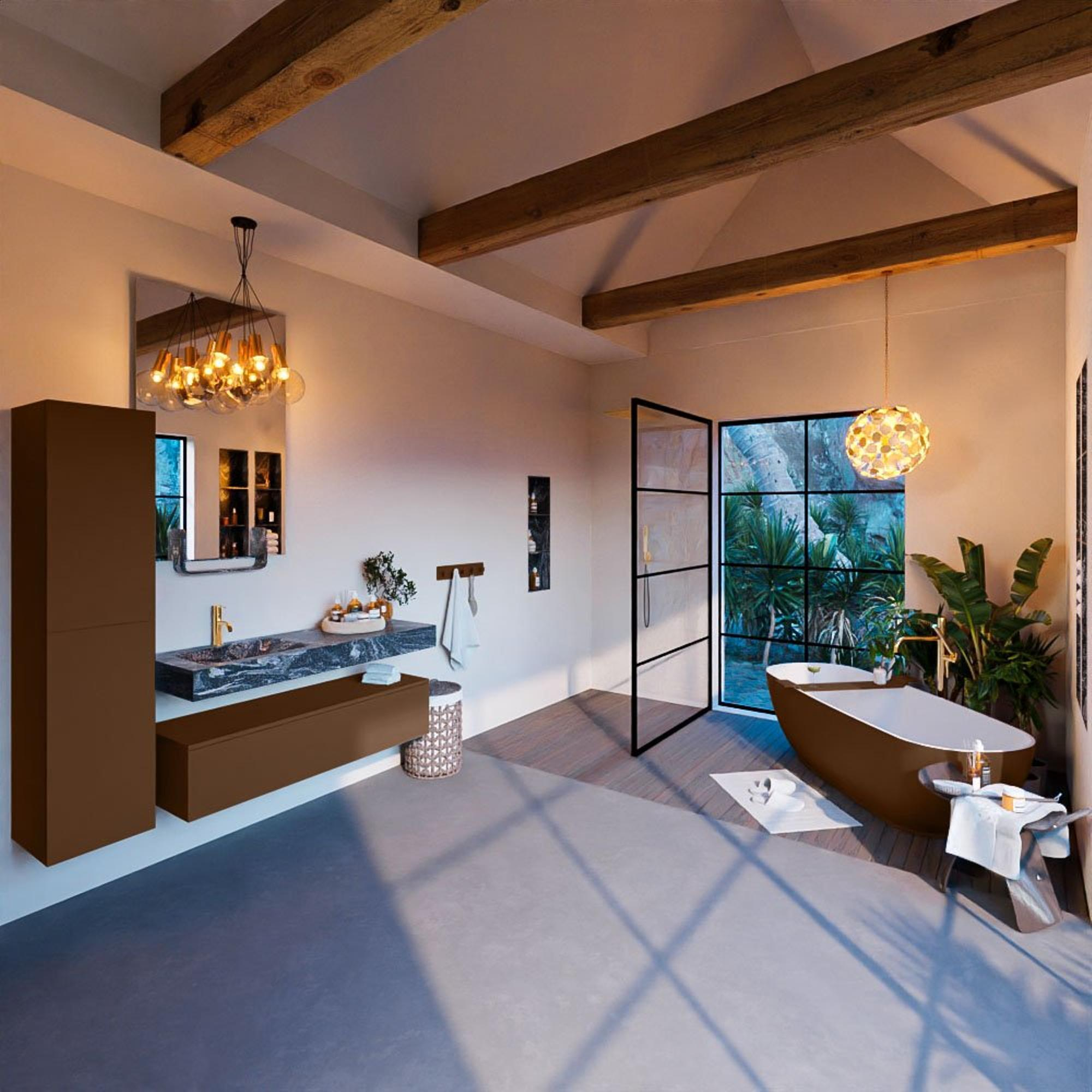 De MONDIAZ ALAN - DLUX badkamermeubelset straalt stijl en elegantie uit. De combinatie van de kleur Rust en de Lava wastafel creëert een luxueuze uitstraling. De vrijhangende wastafel geeft een gevoel van ruimte en lichtheid in de badkamer. De 1 lade zorgt niet alleen voor opbergruimte, maar voegt ook een vleugje klasse toe aan het geheel. Met dit badkamermeubelset voeg je een vleugje luxe toe aan je dagelijkse routine.