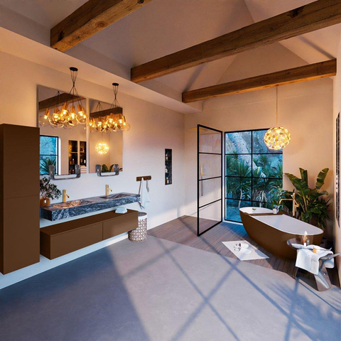 De MONDIAZ ALAN - DLUX Badkamermeubelset straalt stijl en elegantie uit met zijn rustieke ontwerp en vrijhangende wastafel. De subtiele details en de diepe lava-kleur voegen een vleugje luxe toe aan elke badkamer. De 2 lades bieden voldoende opbergruimte voor al je badkamerbenodigdheden, terwijl de 2 wasbakken zorgen voor ultiem gemak en functionaliteit.