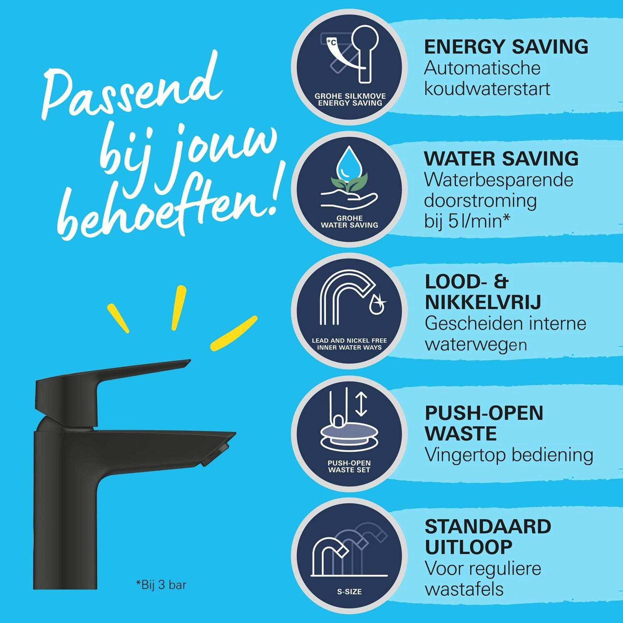 Deze kraan is ontworpen met het oog op gebruiksgemak en eenvoudige installatie. Dankzij de GROHE QuickFix Start methode en het meegeleverde QuickTool is de montage snel en vakkundig te realiseren, zelfs als je geen ervaren klusser bent. De push-open waste werkt met een lichte aanraking, wat het openen en sluiten van de afvoer moeiteloos maakt. Daarnaast zorgt de verhoogde uitloop voor extra ruimte onder de kraan, ideaal voor het wassen van je handen of het vullen van een emmer. Met een doorstroombegrenzer van 5,7 liter per minuut houd je het waterverbruik laag zonder in te leveren op de waterdruk, wat deze kraan ook nog eens milieuvriendelijk maakt.
