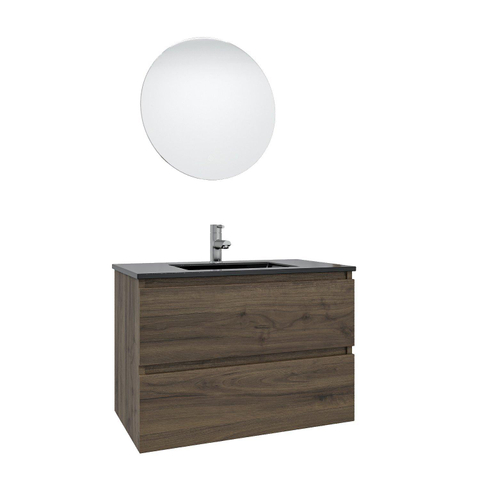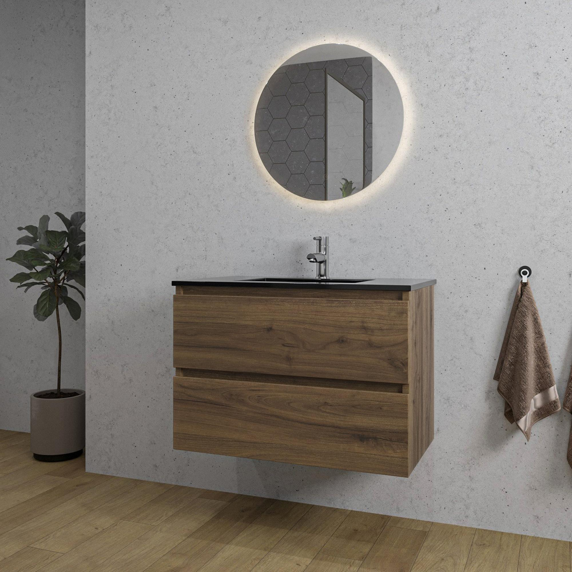 Saniclass Chaci Badkamermeubelset - 80x46x55cm - keramische wastafel zwart - 1 wasbak - 1 kraangat - 2 lades - ronde spiegel met verlichting - noten (hout)