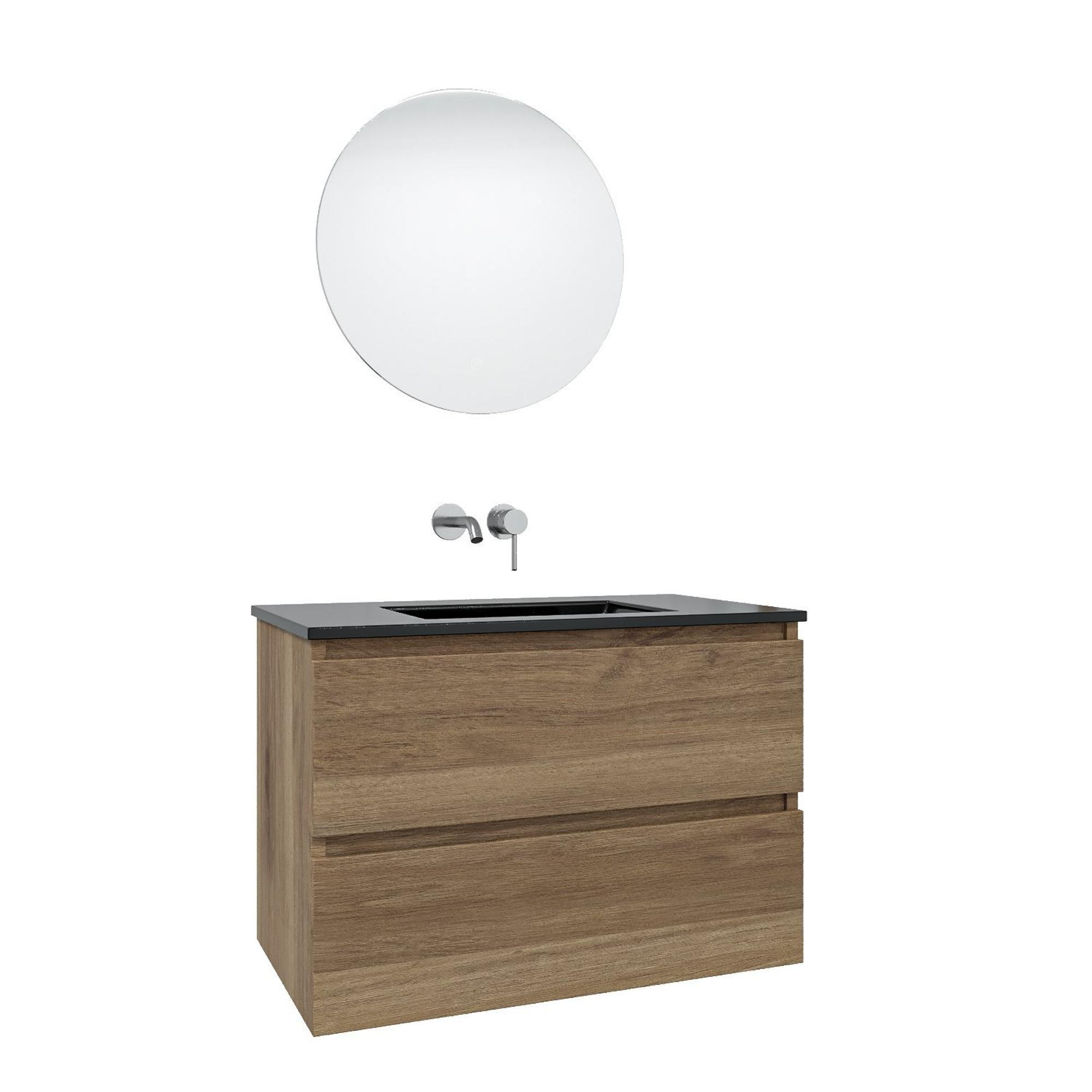 Saniclass Chaci Badkamermeubelset - 80x46x55cm - keramische wastafel zwart - 1 wasbak - zonder kraangat - 2 lades - ronde spiegel met verlichting - eiken