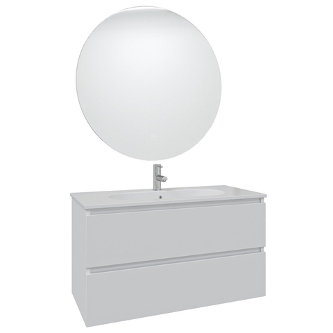 Saniclass Chaci Badkamermeubelset - 100x46x57cm - keramische wastafel wit - 1 ovale wasbak - 1 kraangat - 2 lades - ronde spiegel met verlichting - mat wit