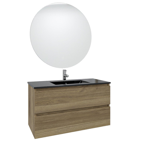 Saniclass Chaci Badkamermeubelset - 100x46x57cm - keramische wastafel zwart - 1 wasbak - 1 kraangat - 2 lades - ronde spiegel met verlichting - eiken