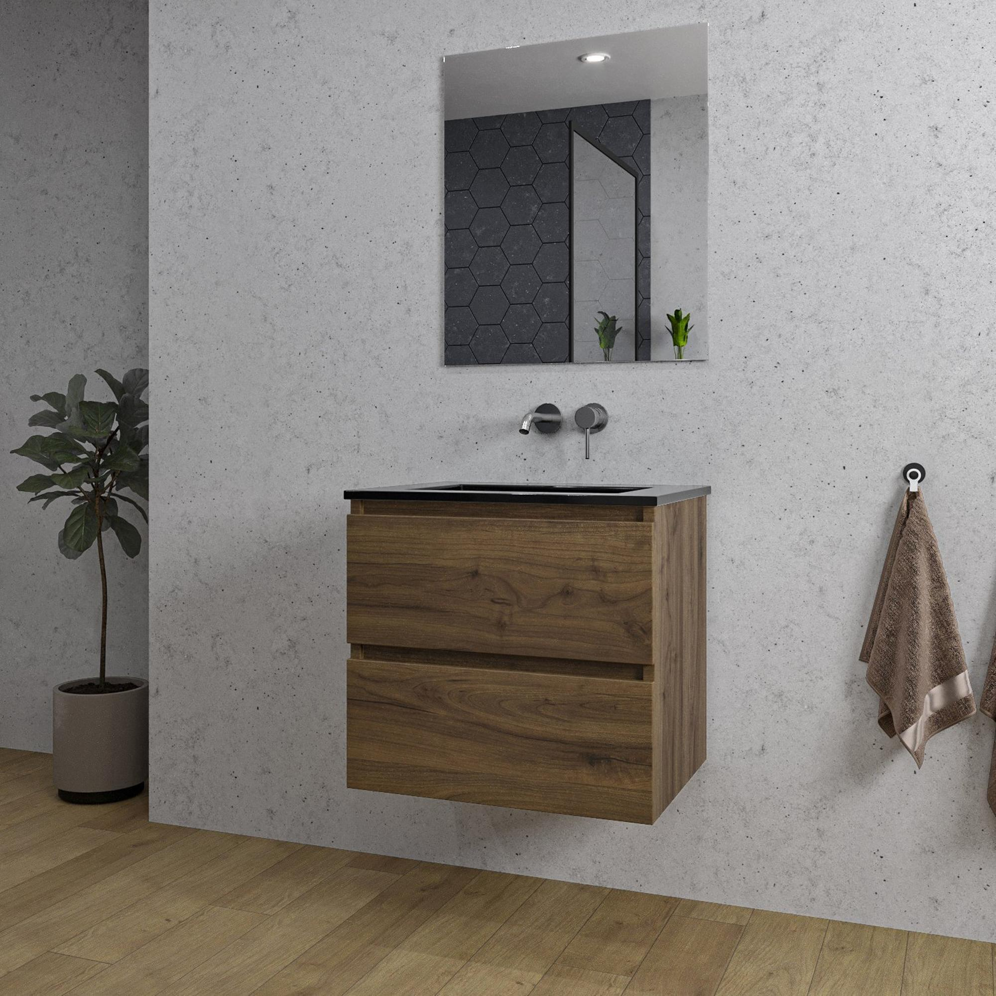 Saniclass Chaci Badkamermeubelset - 60x46x57cm - keramische wastafel zwart - 1 wasbak - zonder kraangaten - 2 lades - rechthoekige spiegel - noten (hout)