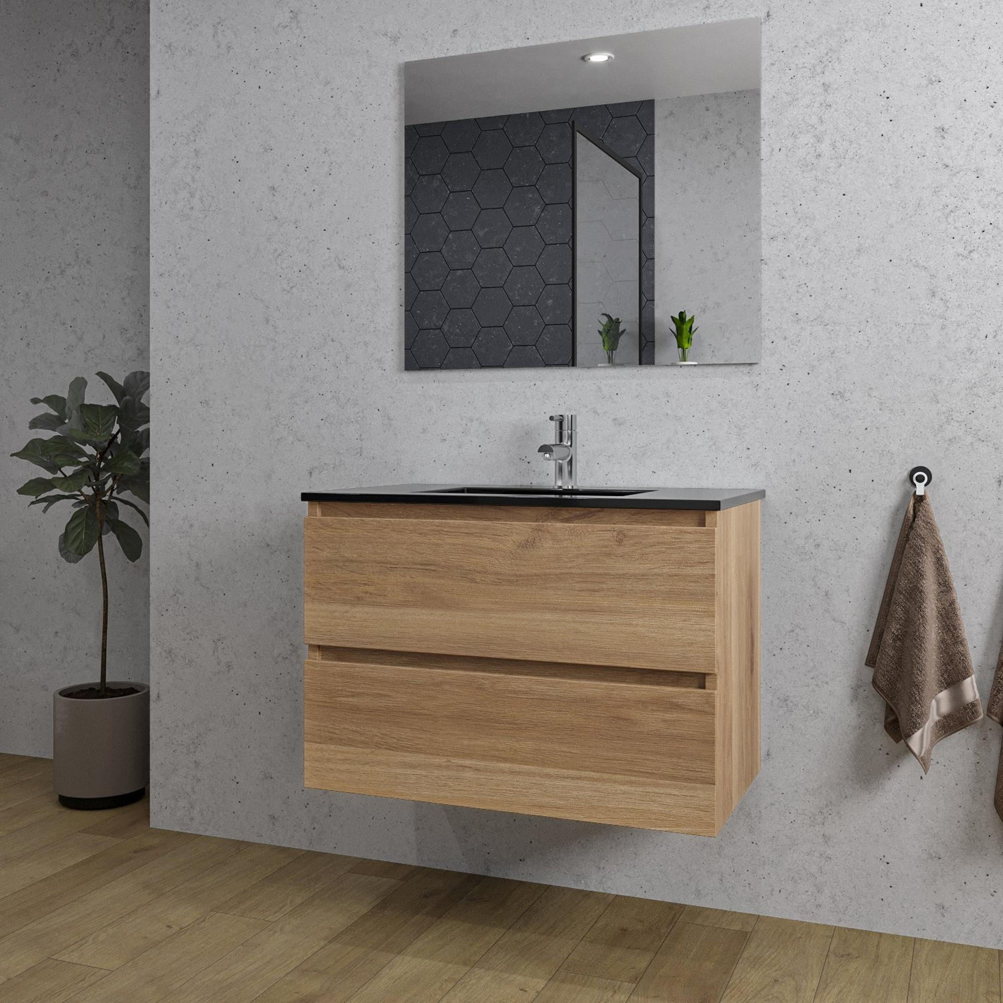 Saniclass Chaci Badkamermeubelset - 80x46x55cm - keramische wastafel zwart - 1 wasbak - 1 kraangat - 2 lades - rechthoekige spiegel - eiken