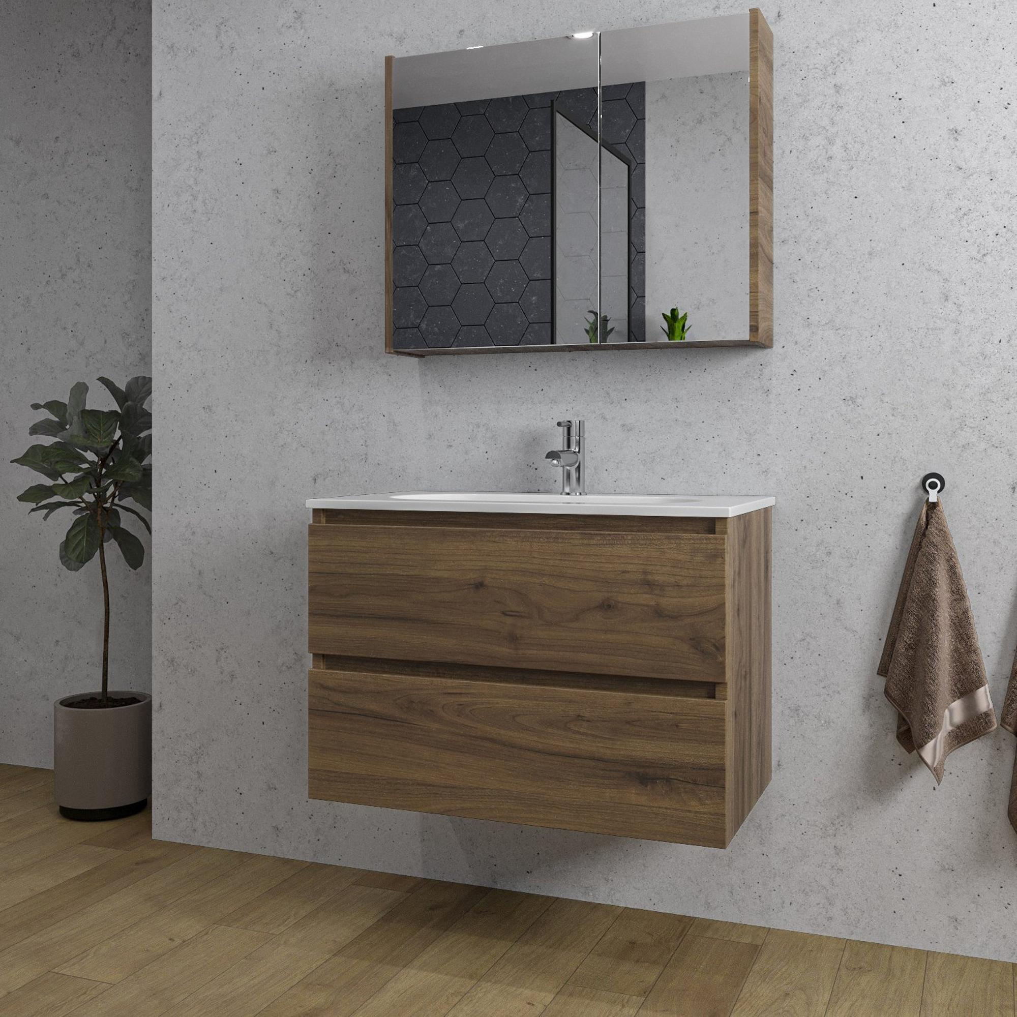 Saniclass Chaci Badkamermeubelset - 80x46x57cm - keramische wastafel wit - 1 ovale wasbak - 1 kraangat - 2 lades - spiegelkast - noten (hout)