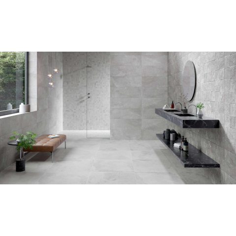 Met de natuursteen look creëer je eenvoudig een luxe spa-uitstraling, maar dan met het gebruiksgemak van een keramische wandtegel. De grijze kleur is neutraal en toch sfeervol, waardoor hij prachtig combineert met witte sanitairproducten, zwarte kranen of juist warme houttinten. De tegel heeft een rustige, maar niet volledig egale uitstraling: lichte nuanceverschillen en steenstructuren geven de muur een natuurlijke, hoogwaardige look. Daardoor is hij uitermate geschikt als doorlopende wand in de douche, achter het bad of als statementwand achter het wastafelmeubel. Grijs is bovendien een tijdloze kleur die niet snel verveelt, waardoor je ook bij toekomstige restyling van je badkamer veel kanten op kunt met andere kleuren en accessoires.