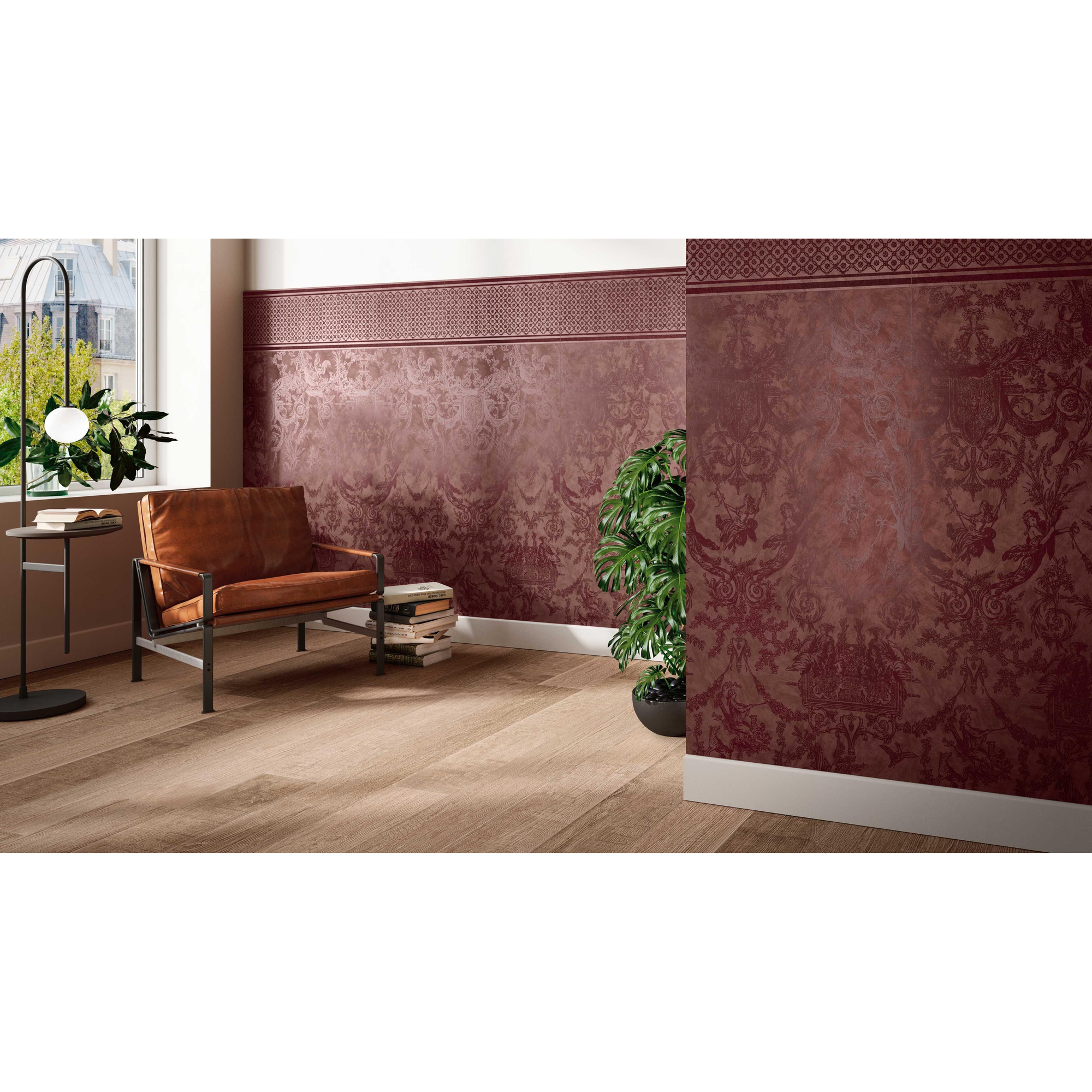 Het karakteristieke Toile de Jouy-dessin in diepe bordeauxtinten geeft jouw badkamer onmiddellijk een rijke, bijna hotelachtige sfeer. Deze decortegel is geïnspireerd op stijlvol behang, maar dan uitgevoerd in hoogwaardig porselein-steengoed. Dat betekent: geen problemen met vocht, geen loslatende banen, maar een wand die jarenlang mooi blijft. Het grote formaat van 60x120 cm zorgt voor rust in het lijnenspel en laat zelfs een compacte ruimte optisch groter lijken. Door één wand of nis te accentueren, creëer je op een subtiele manier een blikvanger, terwijl de rest van de ruimte eenvoudig en tijdloos kan blijven. Zo combineer je uitgesproken design met een badkamer die je niet snel beu raakt.