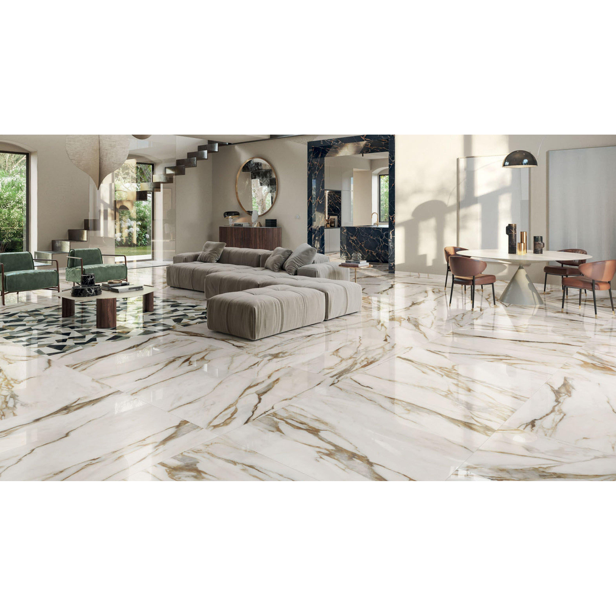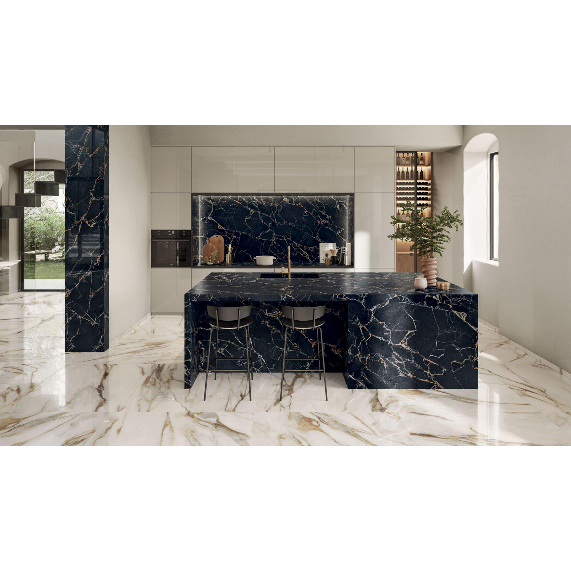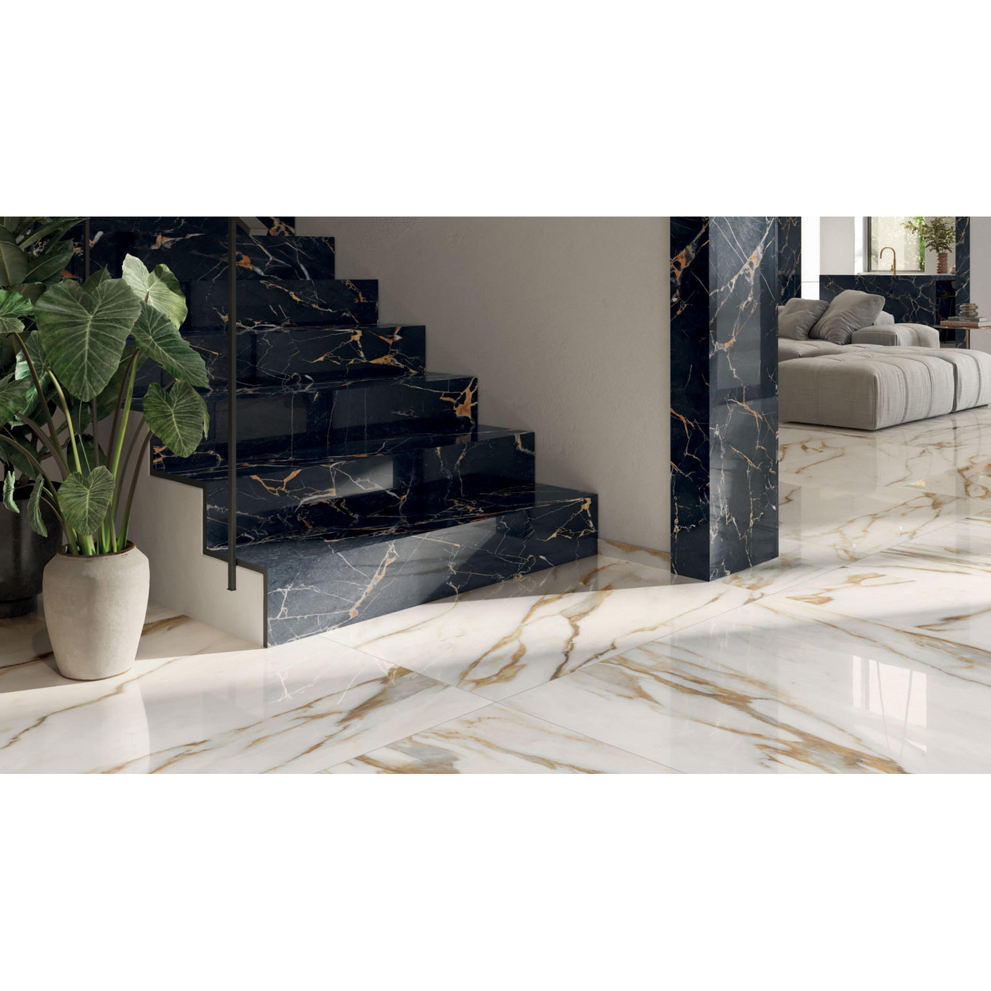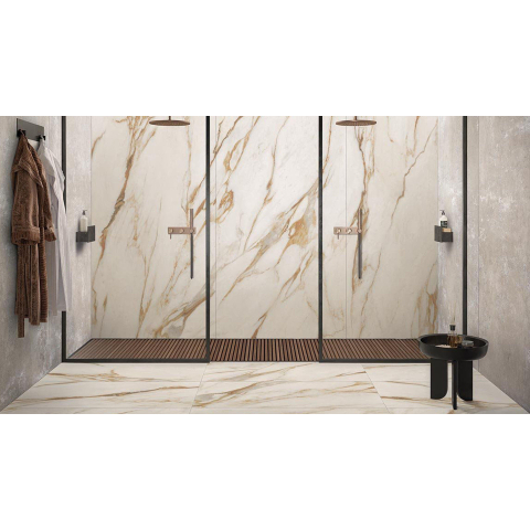 De Abk imoker Signoria tegel straalt een majestueuze uitstraling uit dankzij zijn prachtige marmerlook en glanzende afwerking. De subtiele aders en nuances in de Calacatta Vena Oro (beige) tint geven de tegel een unieke en luxueuze uitstraling die elke ruimte transformeert tot een koninklijk paleis. De grootte van 60x120cm zorgt voor een ruimtelijk effect en laat de tegel nog meer schitteren in zijn pracht.