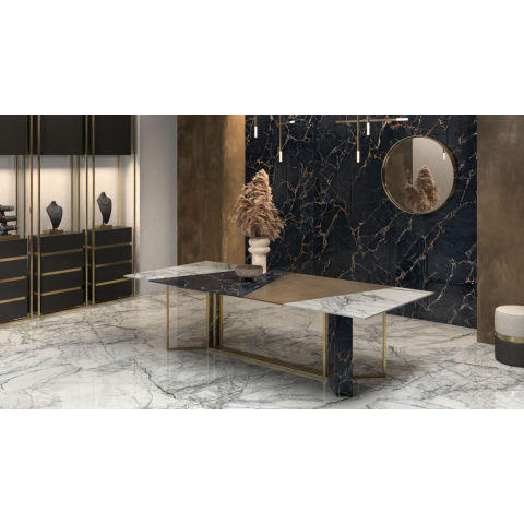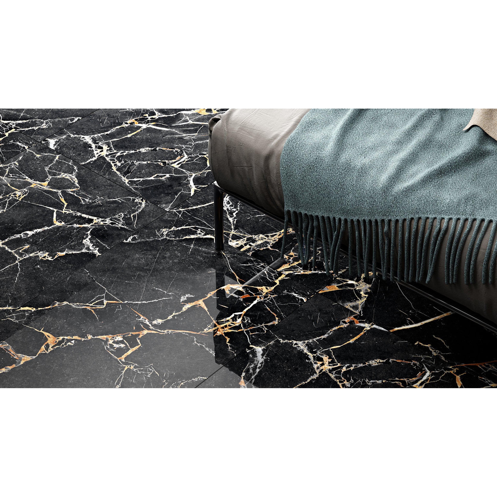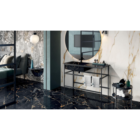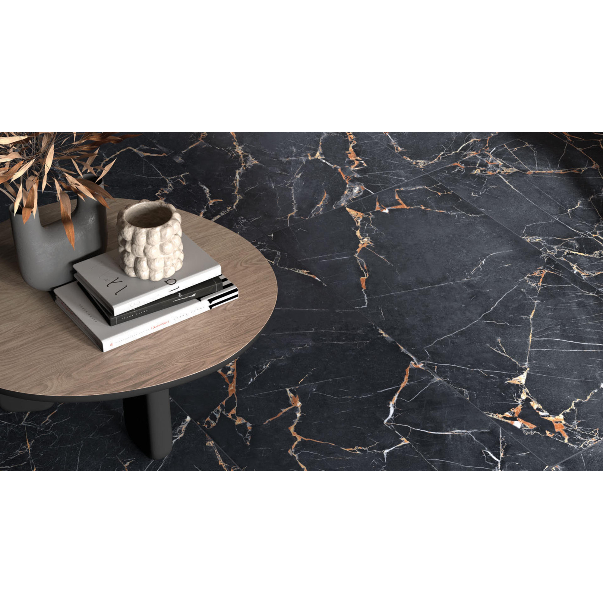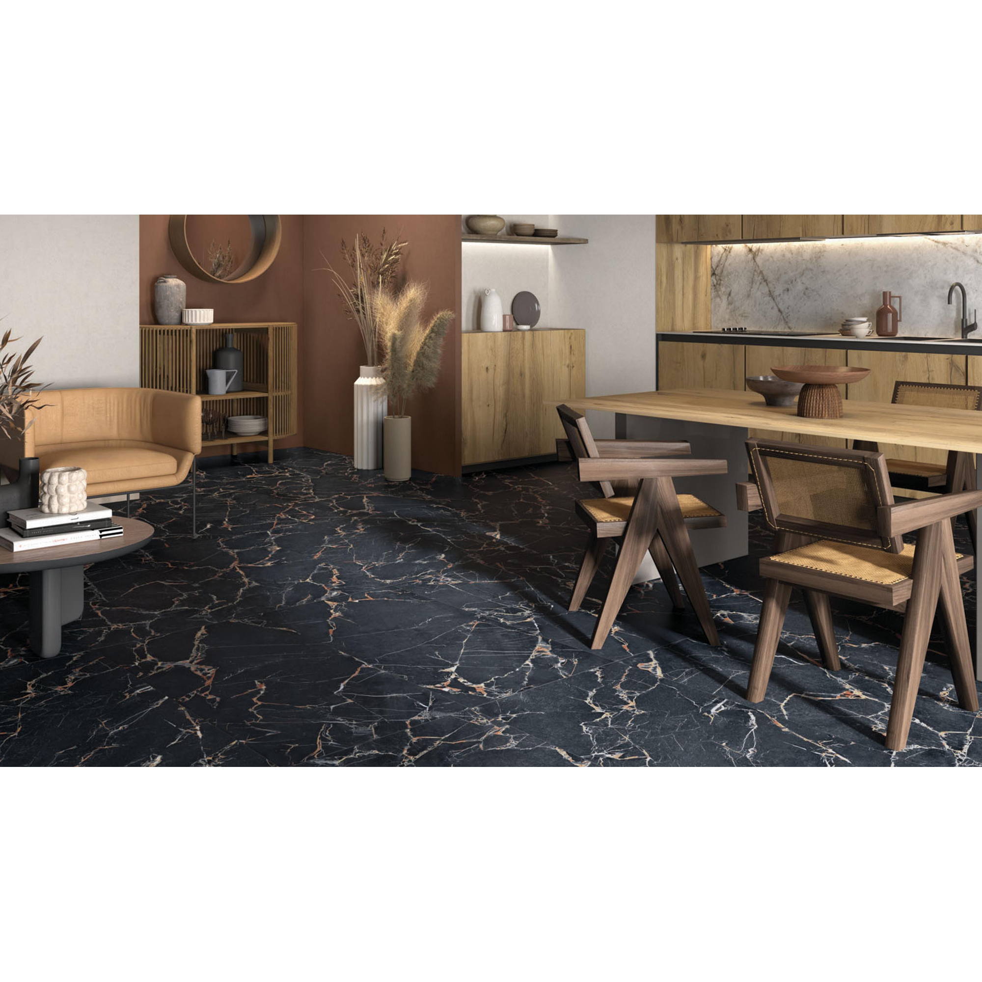 De Abk imoker Signoria tegel straalt een majestueuze allure uit dankzij zijn prachtige marmerlook en glans port gold afwerking. Het diepe zwart met gouden accenten zorgt voor een luxueuze uitstraling die elke ruimte transformeert tot een koninklijk vertrek. Deze tegel is perfect voor wie op zoek is naar een vloer- en wandbekleding die elegantie en grandeur uitstraalt.