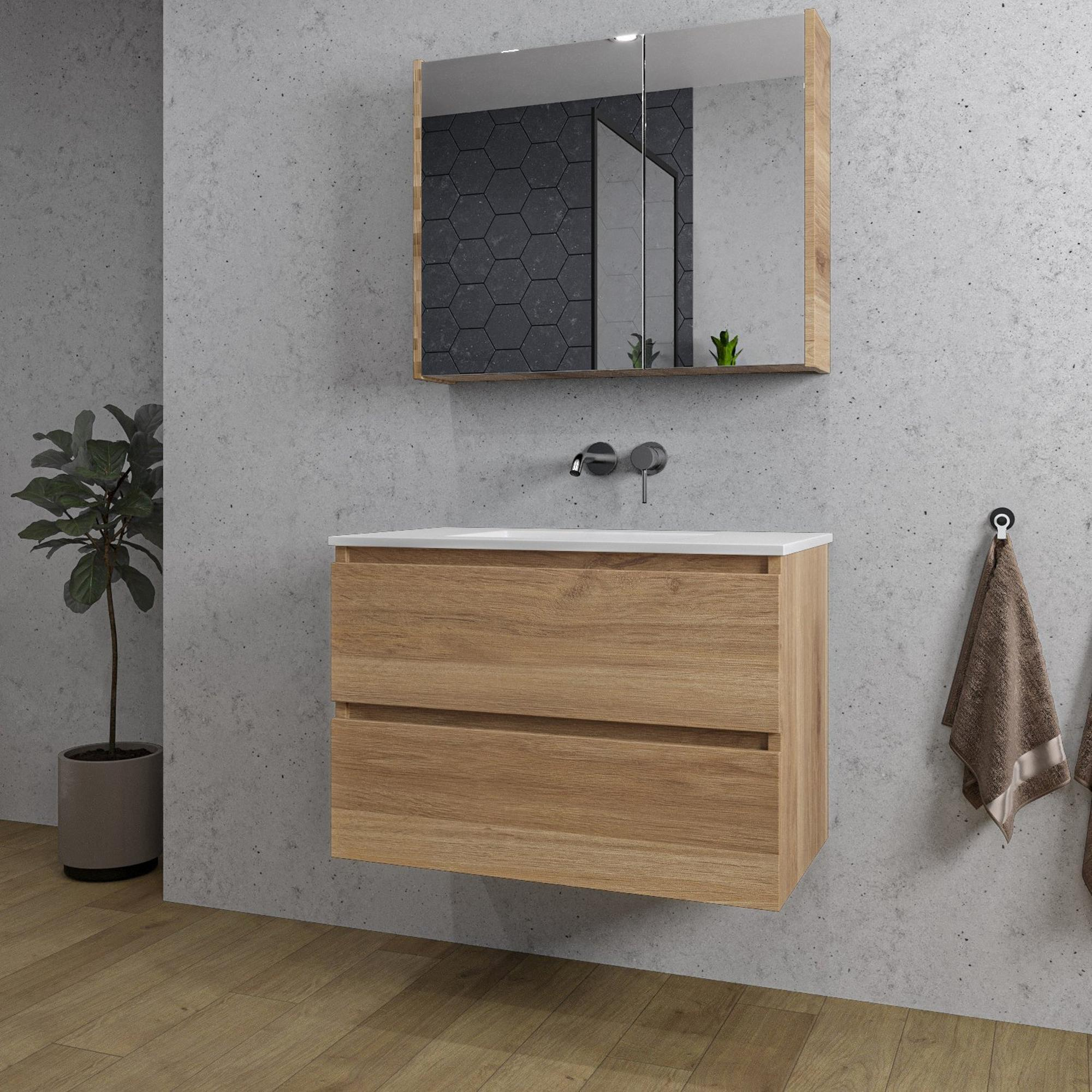 Saniclass Chaci Badkamermeubelset - 80x46x55cm - keramische wastafel wit - 1 wasbak - zonder kraangaten - 2 lades - spiegelkast - eiken