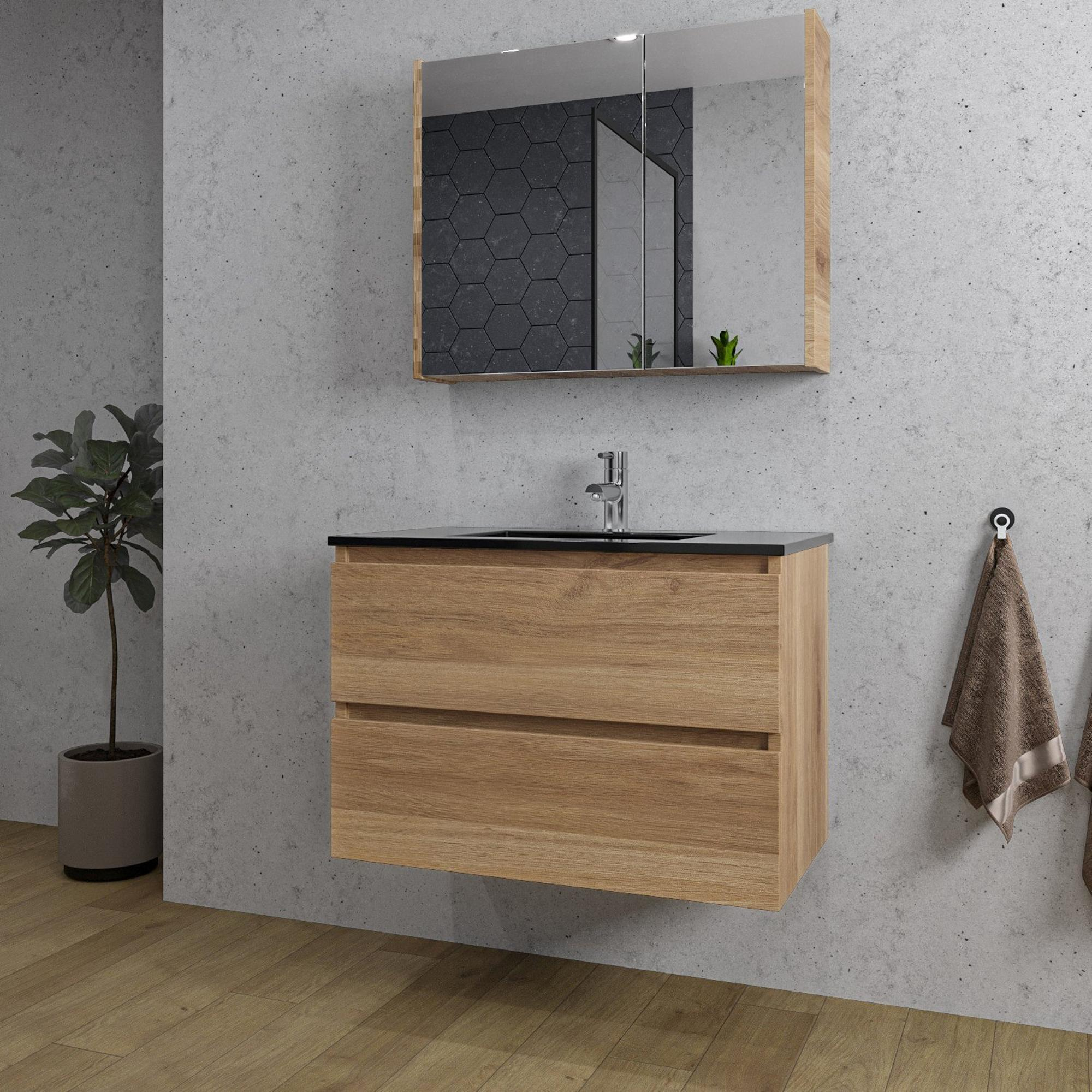 Saniclass Chaci Badkamermeubelset - 80x46x55cm - keramische wastafel zwart - 1 wasbak - 1 kraangat - 2 lades - spiegelkast - eiken