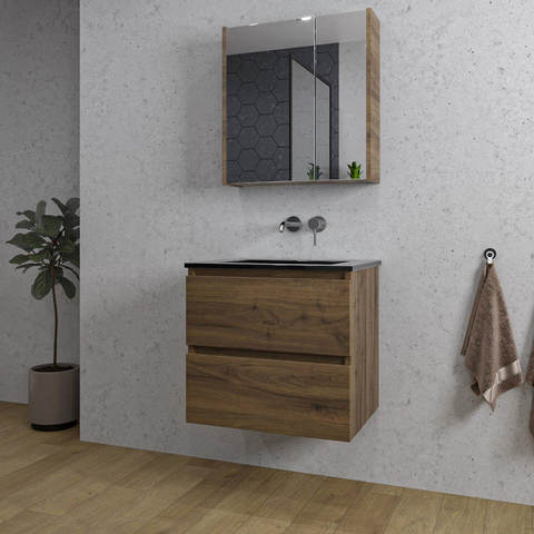 Saniclass Chaci Badkamermeubelset - 60x46x57cm - keramische wastafel zwart - 1 wasbak - zonder kraangaten - 2 lades - spiegelkast - noten (hout)