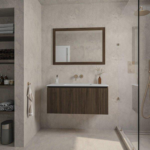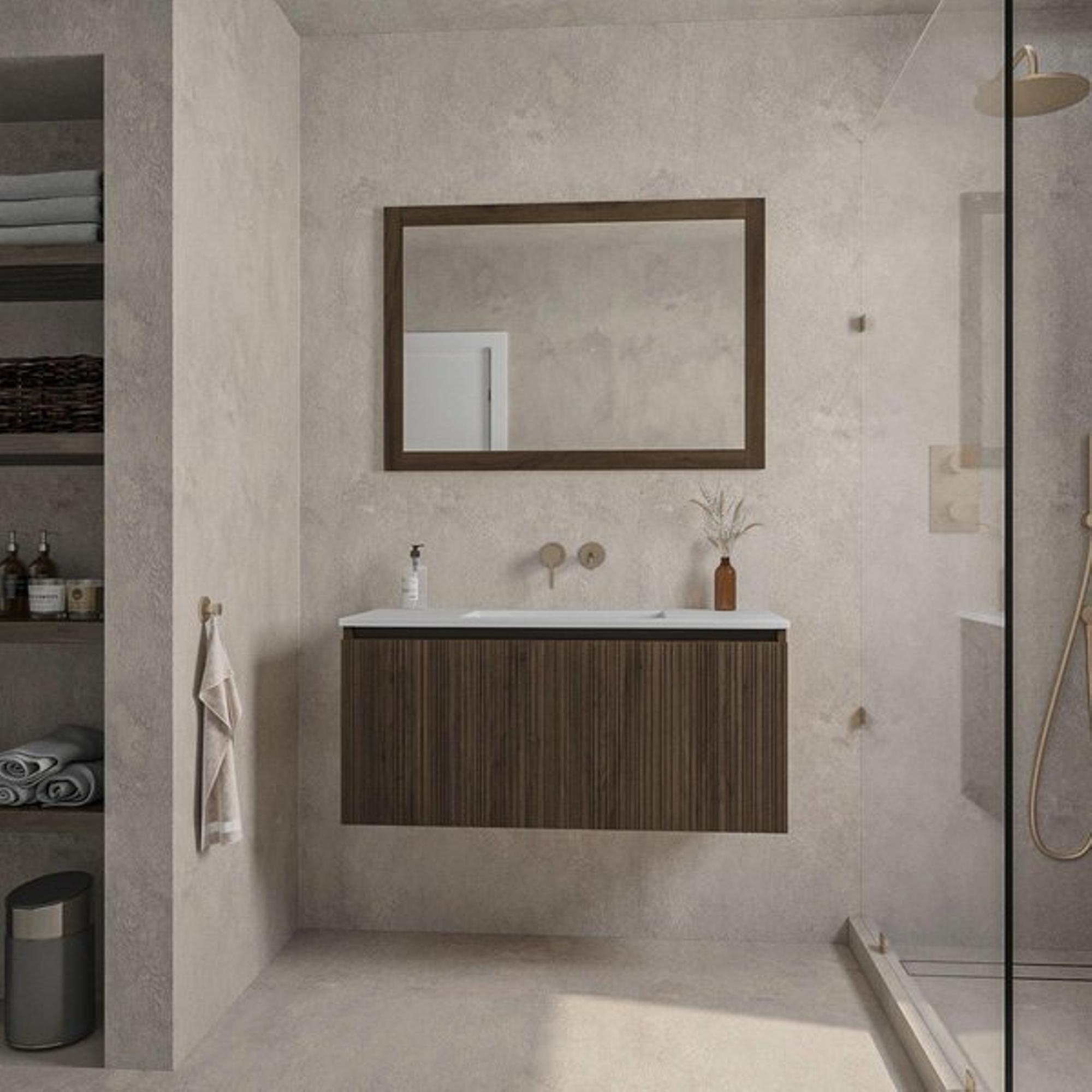 Saniclass Holz Base Badkamermeubelset - 100cm - 1 keramische wasbak wit - zonder kraangat - 1 lade - spiegel - donker eiken