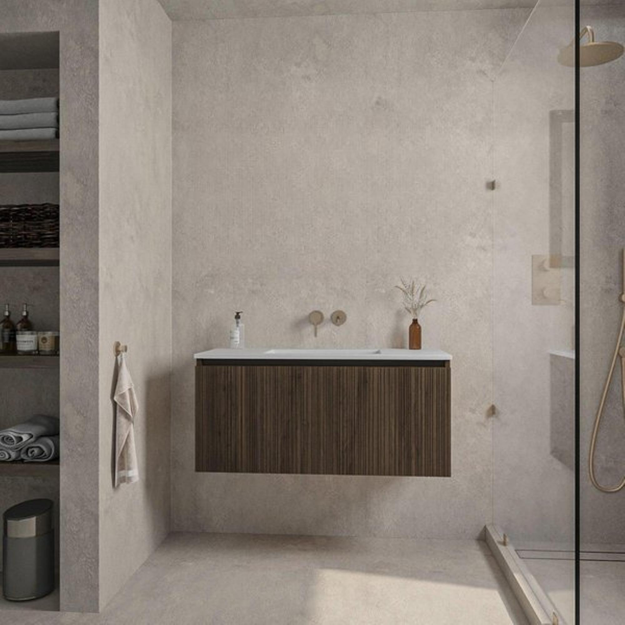Met zijn strakke lijnen en eigentijdse materialen past dit meubelset perfect in een moderne badkamer. De combinatie van mat en glanzend donker eikenhout met keramiek geeft een frisse en stijlvolle uitstraling die moeiteloos aansluit bij de laatste trends. Dit meubelset is ontworpen voor wie houdt van een minimalistische, maar warme inrichting en daarmee een tijdloze sfeer wil creëren die jarenlang meegaat.
