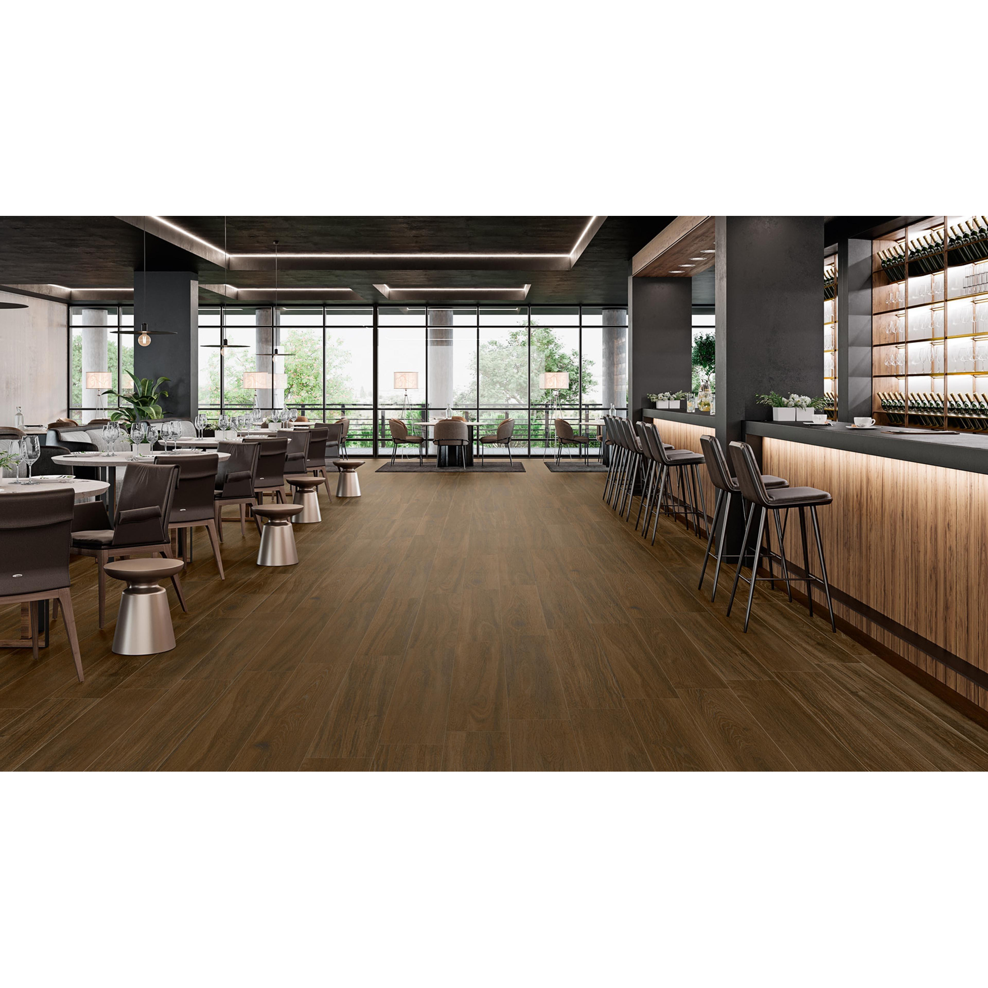 Met het langwerpige formaat van 25x150 cm en de walnut-kleur haal je een sfeervolle houtlook in huis die direct warmte toevoegt aan je badkamer of toiletruimte. De natuurlijke tekening en rustige kleur werken heel mooi in grotere ruimtes, maar geven ook kleine badkamers meteen meer lengte en diepte doordat de lijnen optisch doorlopen. Door de matte afwerking ontstaat geen hinderlijke schittering van spots of daglicht, wat bijdraagt aan een kalme, wellnessachtige sfeer. Combineer deze tegel bijvoorbeeld met strakke witte sanitairproducten en zwarte accenten voor een moderne look, of met zachte tinten en beige voegkleuren voor een natuurlijke, Scandinavische stijl.