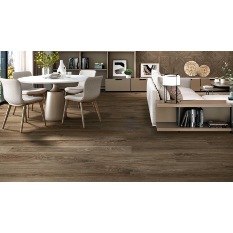 De bruine kleur met houtlook is perfect als je warmte en gezelligheid aan je badkamer wilt toevoegen, zonder dat het druk oogt. Het langwerpige formaat versterkt de plankuitstraling en laat zelfs compacte ruimtes optisch langer en ruimtelijker lijken. Leg je de tegels in een visgraat- of wildverband, dan ontstaat een speelse, designachtige vloer die je badkamer een echte upgrade geeft. De matte toplaag voorkomt hinderlijke schittering, wat vooral prettig is bij spotjes of grote ramen. Omdat de tegel zowel als wandtegel en als vloertegel te gebruiken is, kun je één materiaal doorvoeren en zo een rustige, hoogwaardige basis creëren voor sanitair, meubels en accessoires in vrijwel elke stijl.