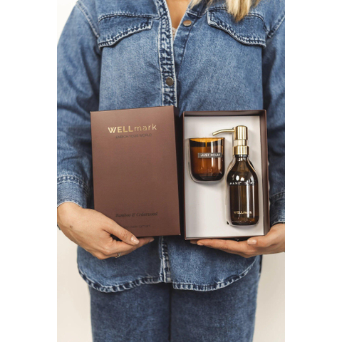 Wellmark Discover giftset - handzeep en geurkaars - bamboo - bruin glas