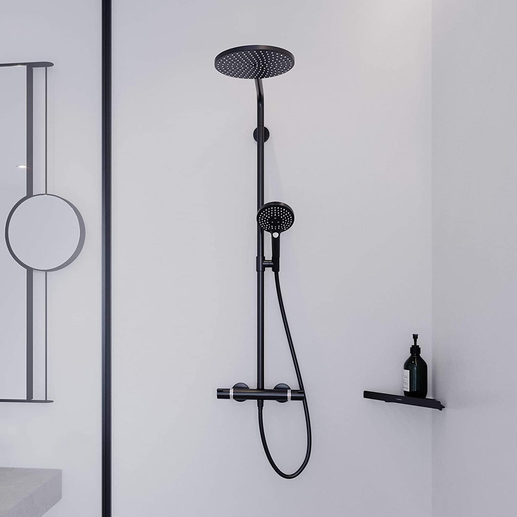 - Bestaat uit hoofddouche, handdouche, douchethermostaat, doucheslang en schuifstuk