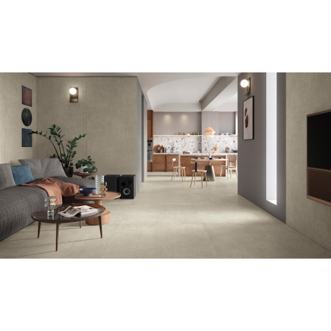 Het grote 120x120 formaat geeft je vloer en wanden een rustige, luxe uitstraling met weinig voegen, waardoor de ruimte optisch groter lijkt. De subtiele betonlook in een lichte talcum-beige tint oogt eigentijds, maar is tegelijkertijd heel tijdloos, zodat je niet snel op de stijl uitgekeken raakt. Dit maakt de tegel ideaal voor wie houdt van een minimalistische basis met veel ruimte om te spelen met accessoires, meubels en sanitair. Door de vlakke oppervlaktestructuur en matte finish oogt alles verfijnd en stijlvol, zonder glans of druk patroon dat onrust kan geven. Perfect als je een hoogwaardige, bijna architectonische uitstraling wilt neerzetten in je badkamer, toilet of leefruimte.