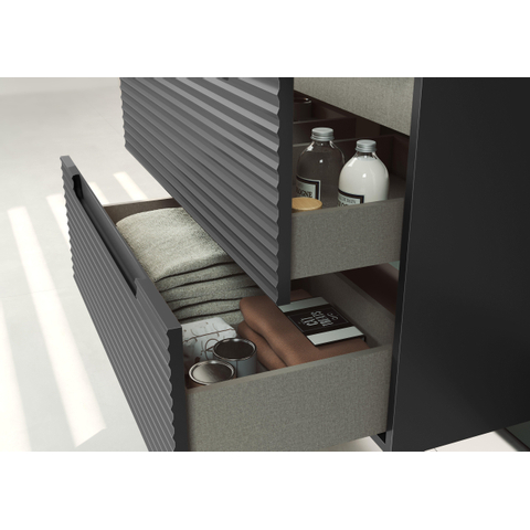 De moderne uitstraling van dit meubel is direct zichtbaar door de matte antraciete afwerking en het minimalistische ontwerp. Het strakke lijnenspel en de geïntegreerde grepen zorgen voor een naadloze look die perfect aansluit bij hedendaagse badkamertrends. Dit meubel is niet alleen een functioneel element, maar ook een stijlvol statement dat jouw badkamer een frisse en eigentijdse uitstraling geeft. Door de subtiele kleur en het verfijnde design past het moeiteloos bij verschillende stijlen, van industrieel tot Scandinavisch, en zorgt het voor een harmonieuze sfeer.