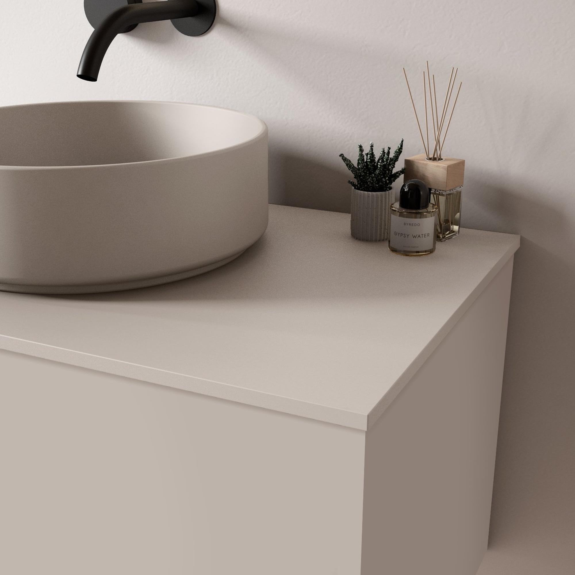 Het matte katoenlook van dit topblad geeft jouw badkamer een tijdloze en verfijnde uitstraling. De zachte beige tint werkt rustgevend en past moeiteloos bij uiteenlopende interieurstijlen, van modern tot klassiek. Door het subtiele design creëer je een harmonieuze sfeer waarin je elke dag weer even tot jezelf kunt komen. Dit topblad is daarmee niet alleen een praktisch element, maar ook een echte blikvanger die je badkamer een persoonlijke touch geeft.