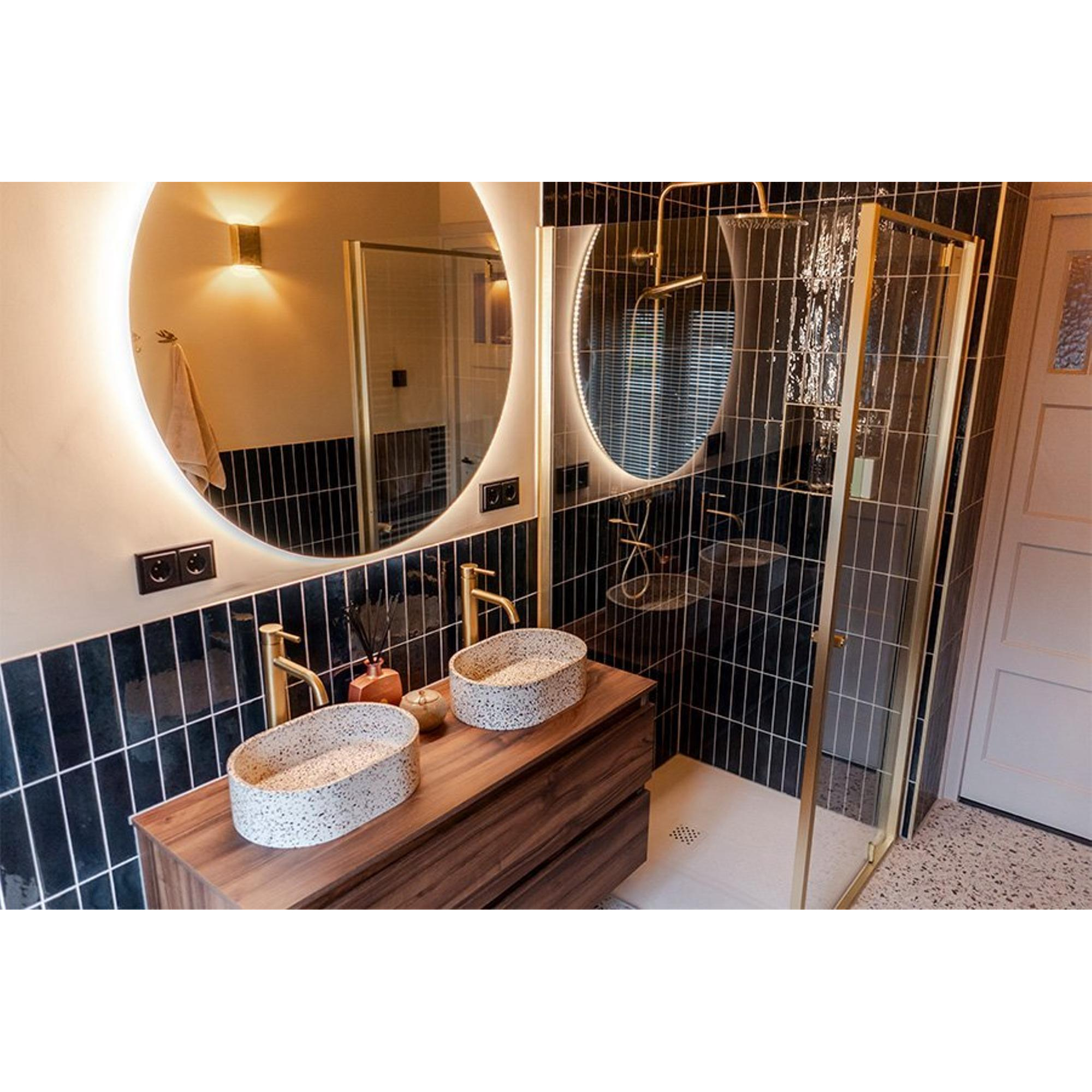Of je nu een moderne, klassieke of landelijke badkamer hebt, dit topblad past zich moeiteloos aan jouw stijl aan. Het is een veelzijdige keuze die je badkamer een persoonlijke en verfijnde touch geeft. Dankzij het tijdloze design en de natuurlijke houtlook creëer je een harmonieuze sfeer die uitnodigt tot ontspanning en comfort. Zo maak je van je badkamer een plek waar je je echt thuis voelt.