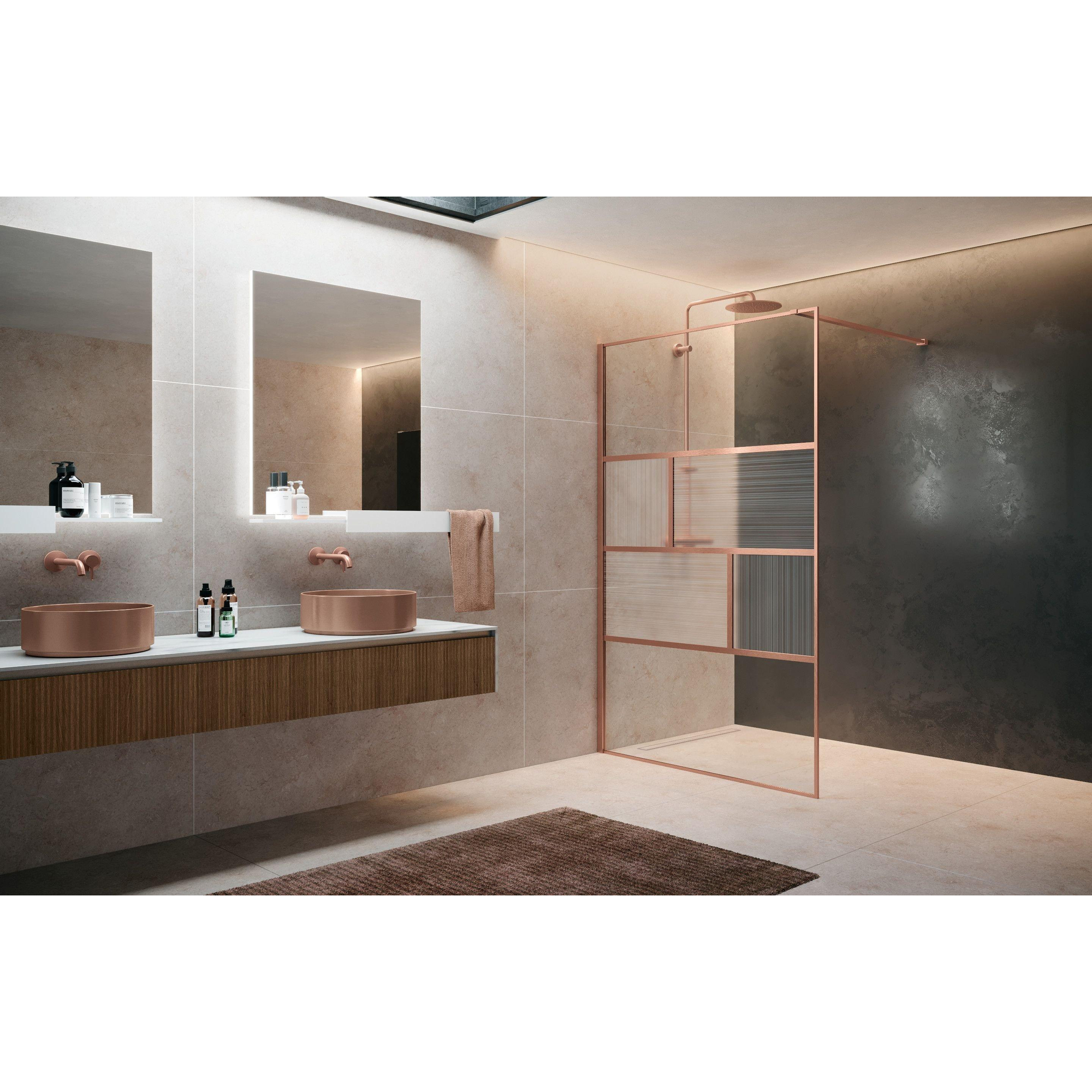 Met zijn strakke lijnen en moderne uitstraling is de Novellini H art Inloopdouche een elegant meesterwerk in de badkamer. Het geborstelde rode goud voegt een warme en uitnodigende sfeer toe, terwijl het ribbelglas linea 1 een subtiel contrast creëert dat de aandacht trekt. Deze inloopdouche combineert moeiteloos functionaliteit met elegantie, waardoor het niet alleen een praktische toevoeging is aan de badkamer, maar ook een statement van stijl en klasse.