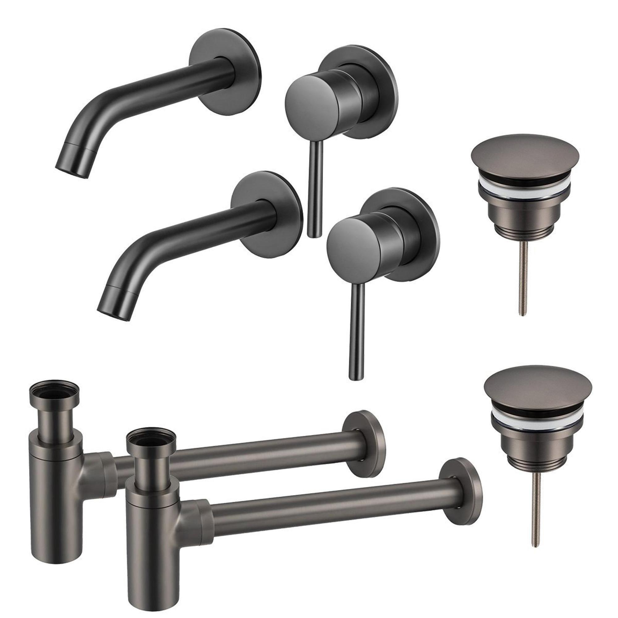 Fortifura Calvi Slim Wastafelkraanset - voor dubbele wastafel - inbouw wastafelkraan - always open plug - design sifon - Geborsteld Gunmetal PVD