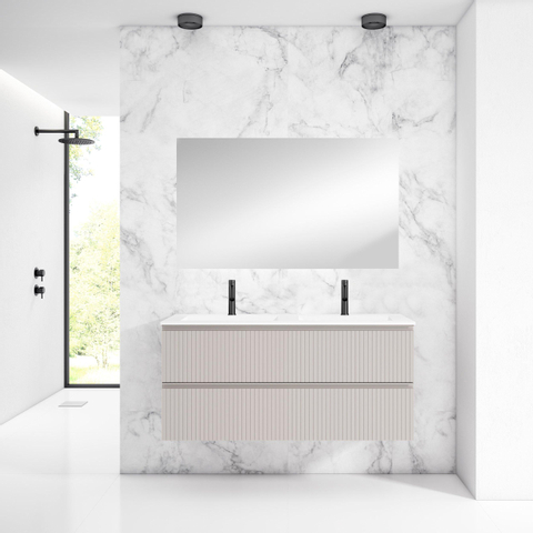 Saniclass Prime Blend Badkamermeubelset - 120x55x46cm - 2 ovale keramische wasbakken wit - 2 kraangaten - 2 lades - rechthoekige spiegel - mat cotton (beige)