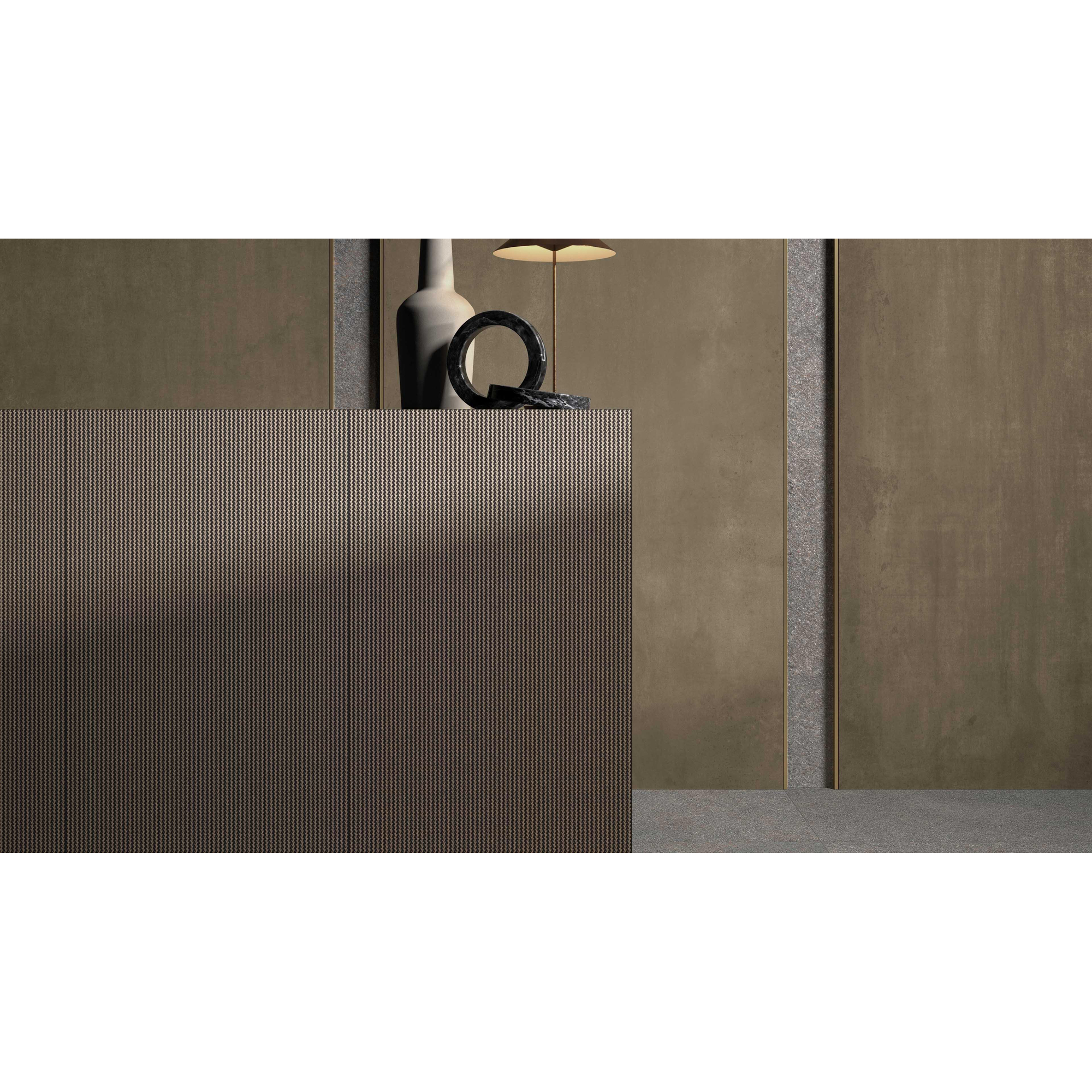 De metaallook in een diepe bruin getinte kleur geeft je interieur direct karakter. In plaats van een koele, industriële uitstraling ontstaat er een warme, verfijnde sfeer die heel goed past bij natuurlijke materialen zoals hout, natuursteen en zachte textielen. De uniforme uitstraling van deze uni-tegel zorgt voor een rustige basis, terwijl de subtiele metaalstructuur voor leven in het oppervlak zorgt zonder onrustig te ogen. Hierdoor is hij uitstekend geschikt als doorlopende vloer in de hele benedenverdieping, maar ook als statementwand in de douche, achter het bad of in de keuken. De bruine tint is bovendien tijdloos en minder gevoelig voor trends, waardoor je jarenlang plezier hebt van je keuze.