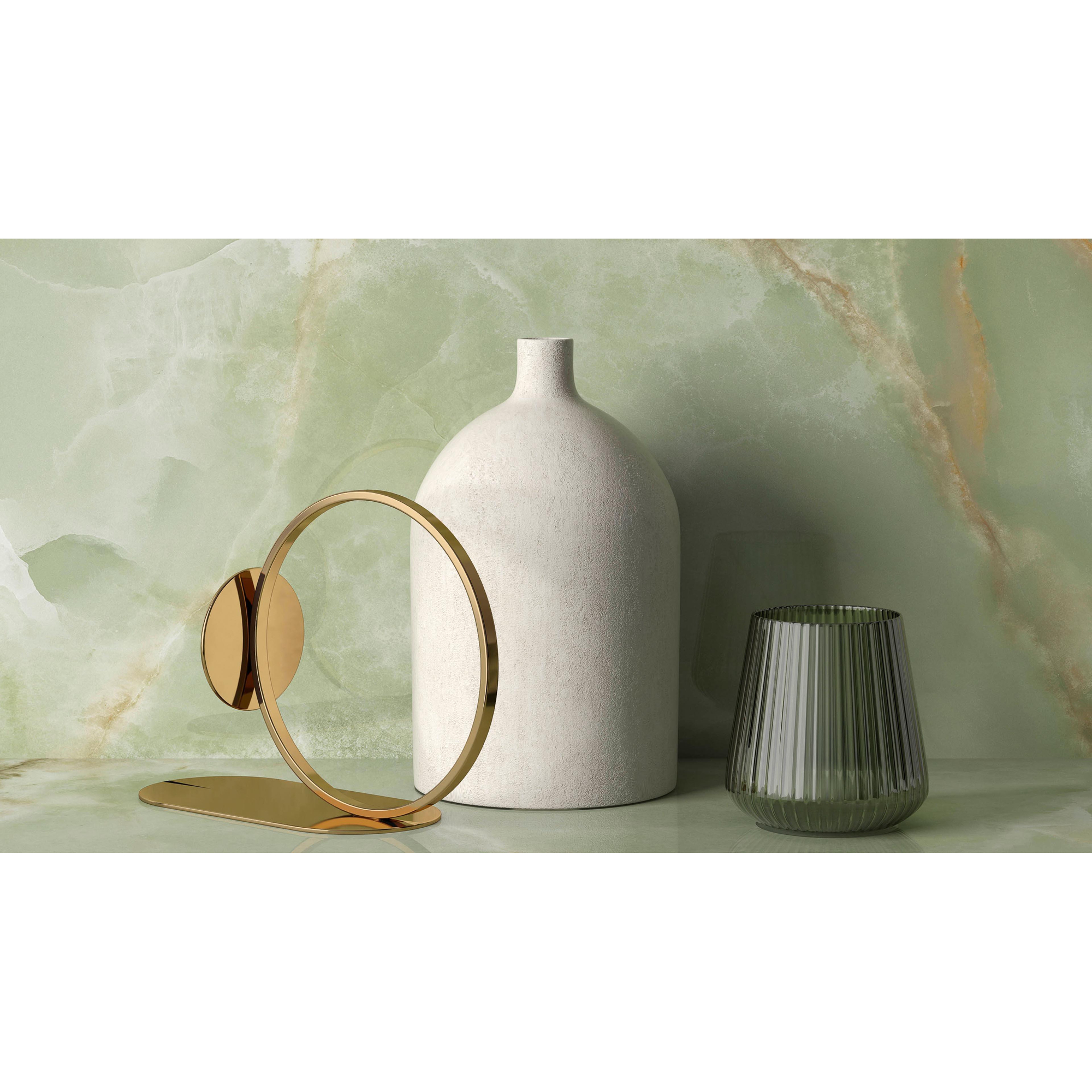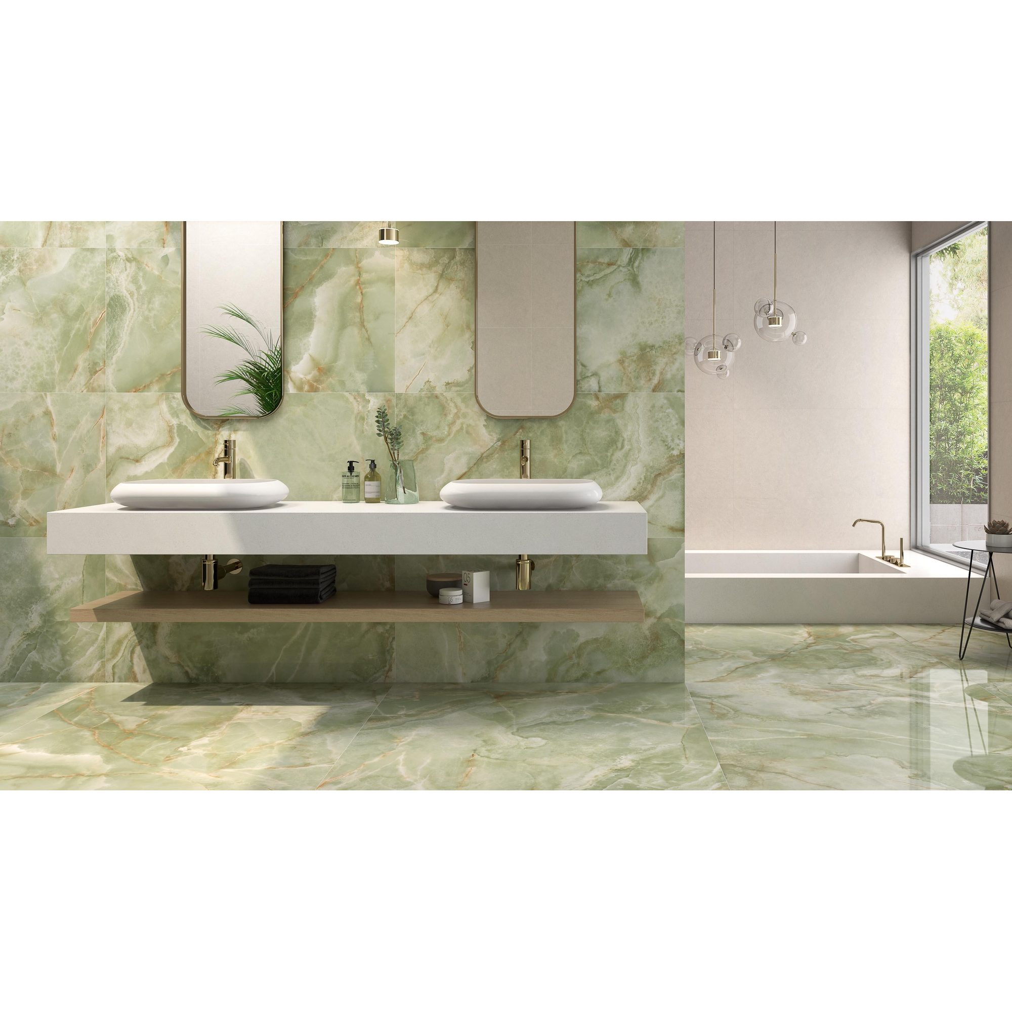 De stijlvolle marmerlook in de Apple kleur geeft je badkamer direct een exclusieve en persoonlijke uitstraling. De groene tint met subtiele adering zorgt voor een unieke, warme sfeer, zonder schreeuwerig te worden. Door de glansafwerking weerkaatst het licht mooi op het oppervlak, wat bijdraagt aan een luxe hotellook. Combineer deze wandtegel met rustige witte sanitairproducten voor een fris contrast, of juist met zwarte kranen en accessoires voor een uitgesproken, modern geheel. Zo kun je eenvoudig jouw eigen stijl neerzetten, van chic en klassiek tot strak en eigentijds.