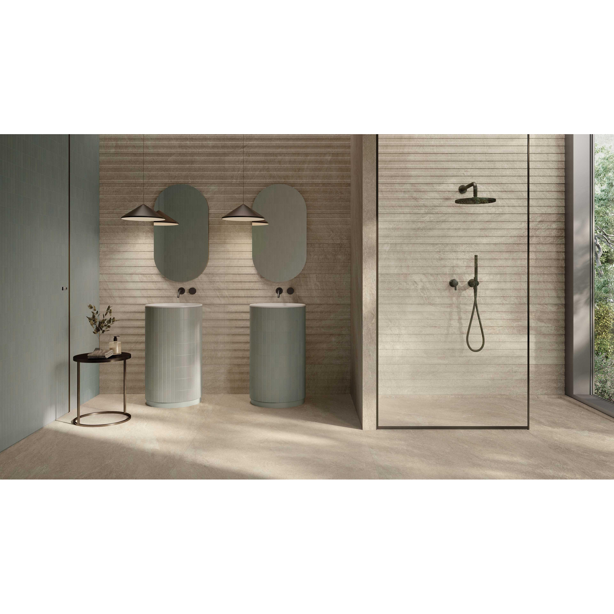 De serie is geïnspireerd op verfijnde kwartsiet, met subtiele aders en kleurnuances die de rust van natuursteen uitstralen, maar dan zonder de gevoeligheid ervan. De taupe tint valt precies tussen grijs en bruin in en werkt daardoor prachtig samen met witte sanitairproducten, zwarte kranen of juist warme houttinten. Door het grote, vierkante formaat ontstaat een strak en ruimtelijk beeld met minder voegen, ideaal als je een chique wellnessuitstraling wilt creëren. De vlakke, matte toplaag zorgt voor een zachte, rustige reflectie van het licht, waardoor je badkamer of living geborgen aanvoelt in plaats van kil. Zo profiteer je van een tijdloos design dat niet snel gaat vervelen en eenvoudig te combineren is met andere materialen en kleuren.