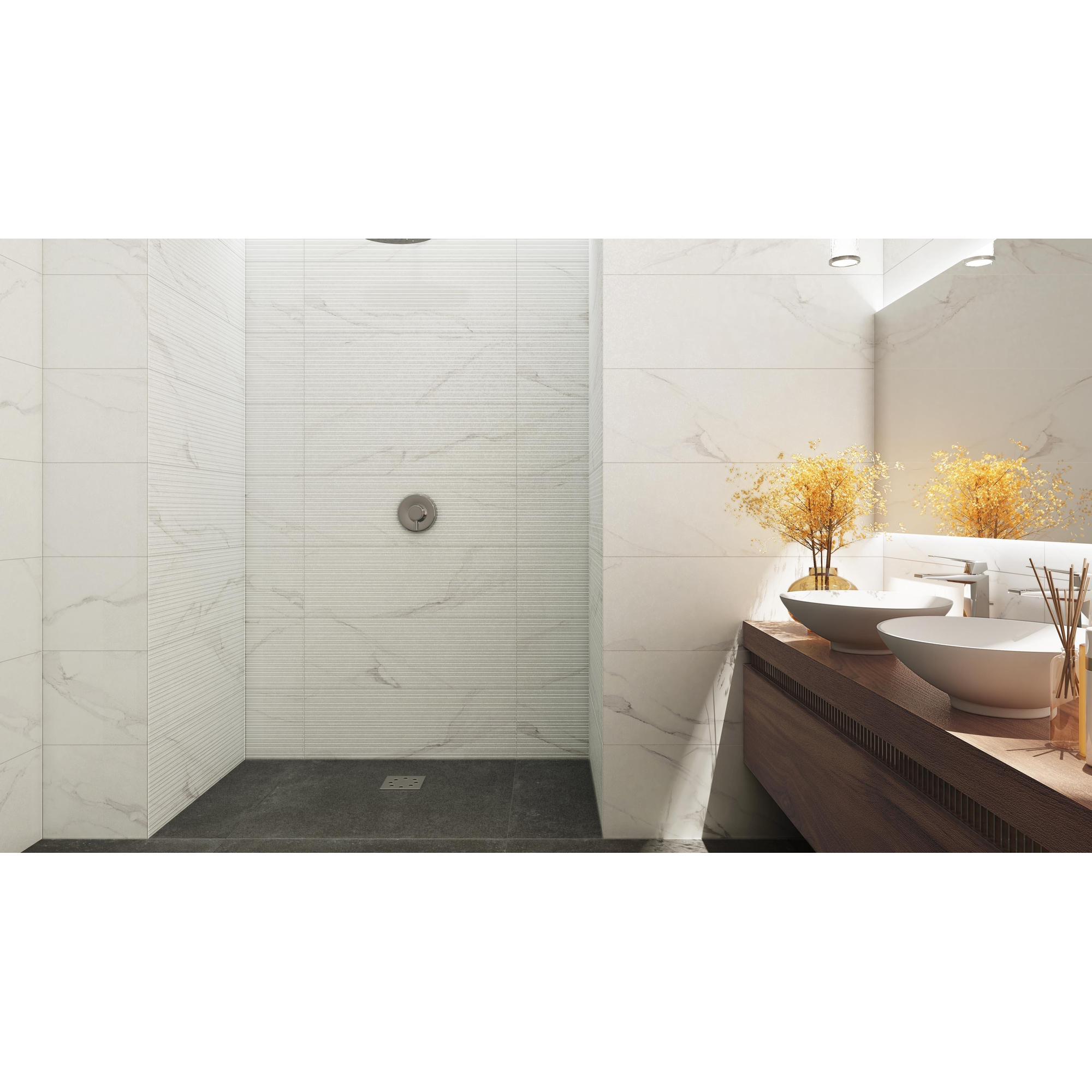 De combinatie van een hoogglans oppervlak met een marmerachtige look zorgt voor een elegante, tijdloze uitstraling. Het witte oppervlak weerkaatst het licht en maakt zelfs compacte badkamers lichter en luchtiger. Tegelijkertijd zorgt de natuursteen look voor subtiele nuances, zodat de wand niet saai of klinisch oogt. Dit maakt de tegel bijzonder geschikt als basis voor uiteenlopende stijlen: combineer met houttinten voor een warme spa-sfeer, met zwarte accenten voor een chique hotellook of met zachte zandkleuren voor een rustige, mediterrane uitstraling. Zo bouw je met één type wandtegel eenvoudig een stijlvol totaalplaatje op.