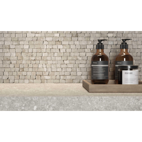 De Dune-kleur van dit mozaïek is een zachte beige zandtint die direct warmte en rust in de ruimte brengt. Ideaal wanneer je houdt van een serene wellness-uitstraling, maar ook perfect te combineren met zwart, wit of houttinten voor een modern hotelgevoel. Omdat de tegel een natuursteenlook heeft, creëer je gemakkelijk een luxe uitstraling zonder het onderhoud van echt natuursteen. Plaats het mozaïek bijvoorbeeld in de douchehoek, als accentstrook of achter het bad om een subtiel, maar karaktervol effect te krijgen. De egale, matte afwerking voorkomt hinderlijke schittering en zorgt ervoor dat de ruimte rustig en ruimtelijk blijft ogen, zelfs in kleinere badkamers.