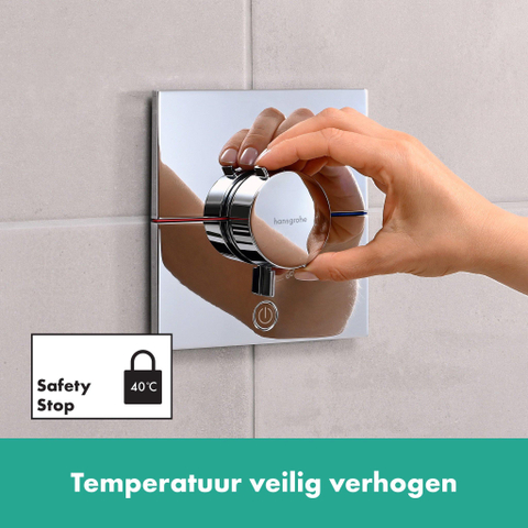 De bediening van deze inbouwmengkraan is bijzonder gebruiksvriendelijk en veilig. Met één druk op de knop start of stop je de waterstroom, terwijl de onderste greep je volledige controle geeft over de waterhoeveelheid. De thermostaat houdt de temperatuur constant, zodat je nooit meer plotseling wordt verrast door koud of heet water. De SafetyStop voorkomt dat heet water per ongeluk vrijkomt, wat extra bescherming biedt voor jou en je gezin. Bovendien is de kraan voorbereid op uitbreiding met extra functies, zodat je jouw douche-ervaring eenvoudig kunt personaliseren. Dit maakt het product niet alleen praktisch, maar ook toekomstbestendig.