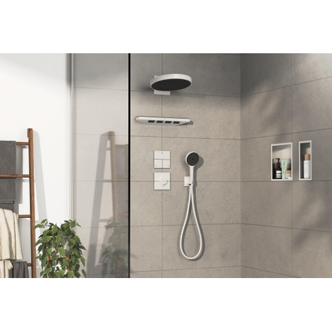 De bediening van maximaal drie functies gaat moeiteloos en snel dankzij de grote Select-knoppen. Je schakelt eenvoudig tussen bijvoorbeeld de hoofddouche, handdouche en zijstralen, en kunt zelfs meerdere functies tegelijk gebruiken voor een complete douchebeleving. De kraan werkt perfect samen met een aparte thermostaatkraan, waarmee je waterhoeveelheid en temperatuur nauwkeurig regelt. Dankzij het inbouwsysteem creëer je bovendien extra ruimte in je douche, wat het comfort en de bewegingsvrijheid vergroot. Flexibiliteit staat centraal, want de wandrozet kan achteraf nog worden uitgelijnd voor een perfecte pasvorm.
