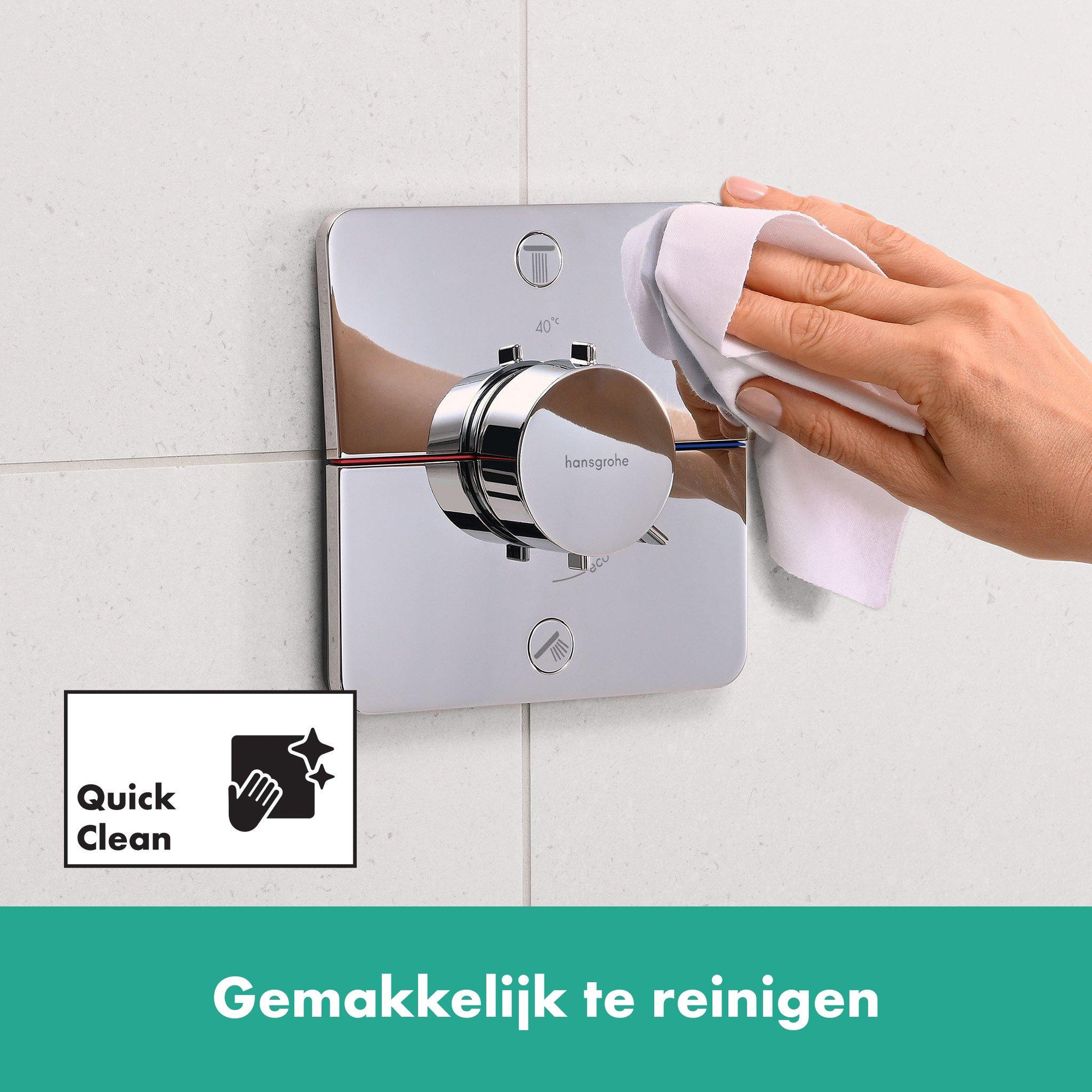 Met hoogwaardige metalen onderdelen en een robuuste afwerking is deze thermostaatkraan gemaakt om jarenlang mee te gaan. De materialen zijn zorgvuldig geselecteerd voor hun lange levensduur en bestand tegen dagelijks gebruik. Daarnaast zorgt de ingebouwde SafetyStop ervoor dat heet water pas vrijkomt nadat je een knop indrukt, wat extra veiligheid biedt voor jou en je gezin. Ook is het product voorbereid op thermische desinfectie, wat bijdraagt aan een hygiënische doucheomgeving. Zo investeer je in een betrouwbaar en veilig product dat je badkamer jarenlang verrijkt.Functioneel