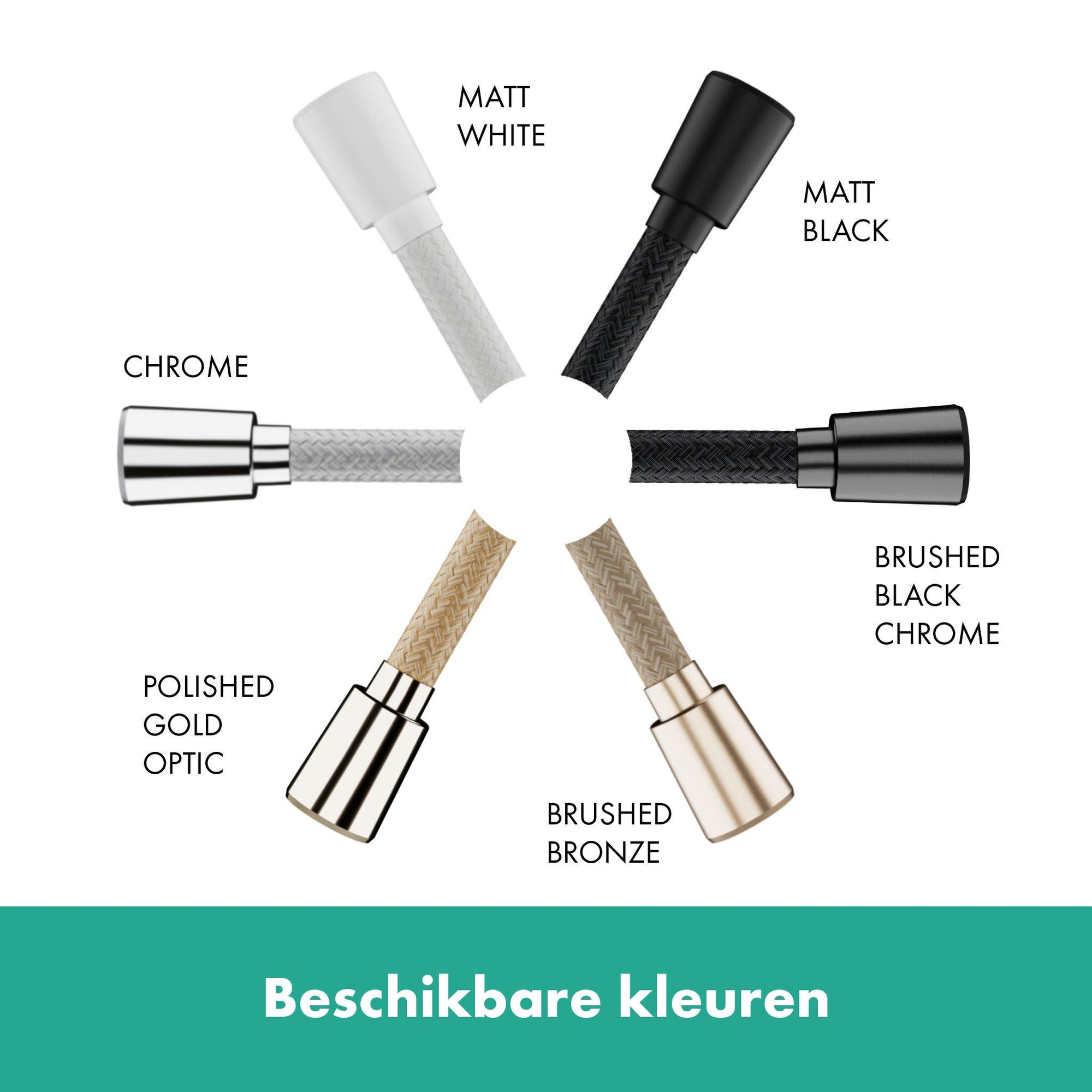 De doucheslang is afgewerkt in een prachtige Brushed Black Chrome kleur die moeiteloos aansluit bij moderne badkamerinterieurs. Het veelkleurige textielmesh geeft een uniek, verfijnd uiterlijk dat perfect combineert met de bijpassende afwerkingen van je douche en kranen. Dit zorgt niet alleen voor een harmonieuze uitstraling, maar maakt van je douchehoek een echte blikvanger. Door de subtiele glans en het hoogwaardige design voelt je badkamer direct luxer en uitnodigender aan. Zo geniet je niet alleen van comfort, maar ook van een stijlvolle upgrade die je badkamer compleet maakt.