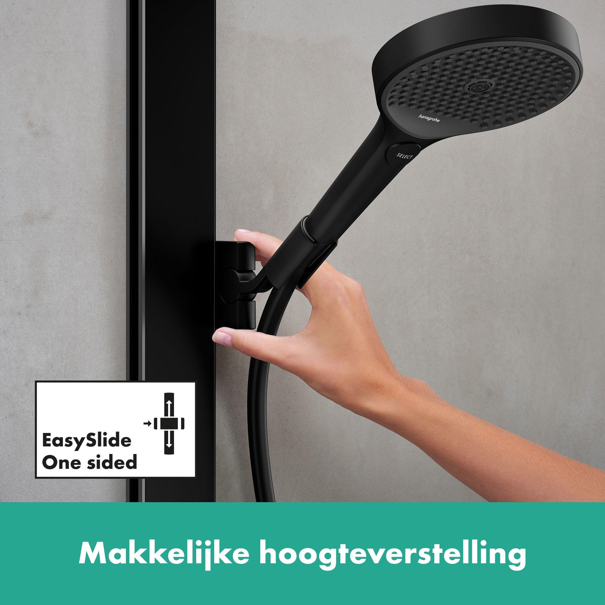 Met deze complete set beschik je over een veelzijdige douche-ervaring. De hoofddouche met een straaloppervlak van 250 mm biedt een zachte, volle PowderRain-straal die je omhult met een verfrissende waterbeleving. De handdouche beschikt over drie straalsoorten, waaronder Intense PowderRain en MonoRain, zodat je altijd de juiste waterstraal kiest. De geïntegreerde thermostaat met veiligheidsblokkering bij 40°C en vooraf instelbare maximale warmwatertemperatuur zorgt voor optimale controle en veiligheid. Het schuifstuk is 90° verstelbaar en zwenkbaar, waardoor je de douchekop eenvoudig in de gewenste positie zet. Zo geniet je van een comfortabele en veilige douche, afgestemd op jouw wensen.