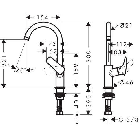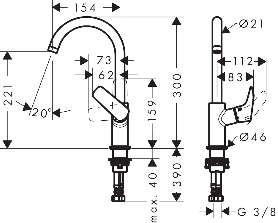 - Uitloophoogte van 221 mm en voorsprong van 154 mm voor optimale functionaliteit