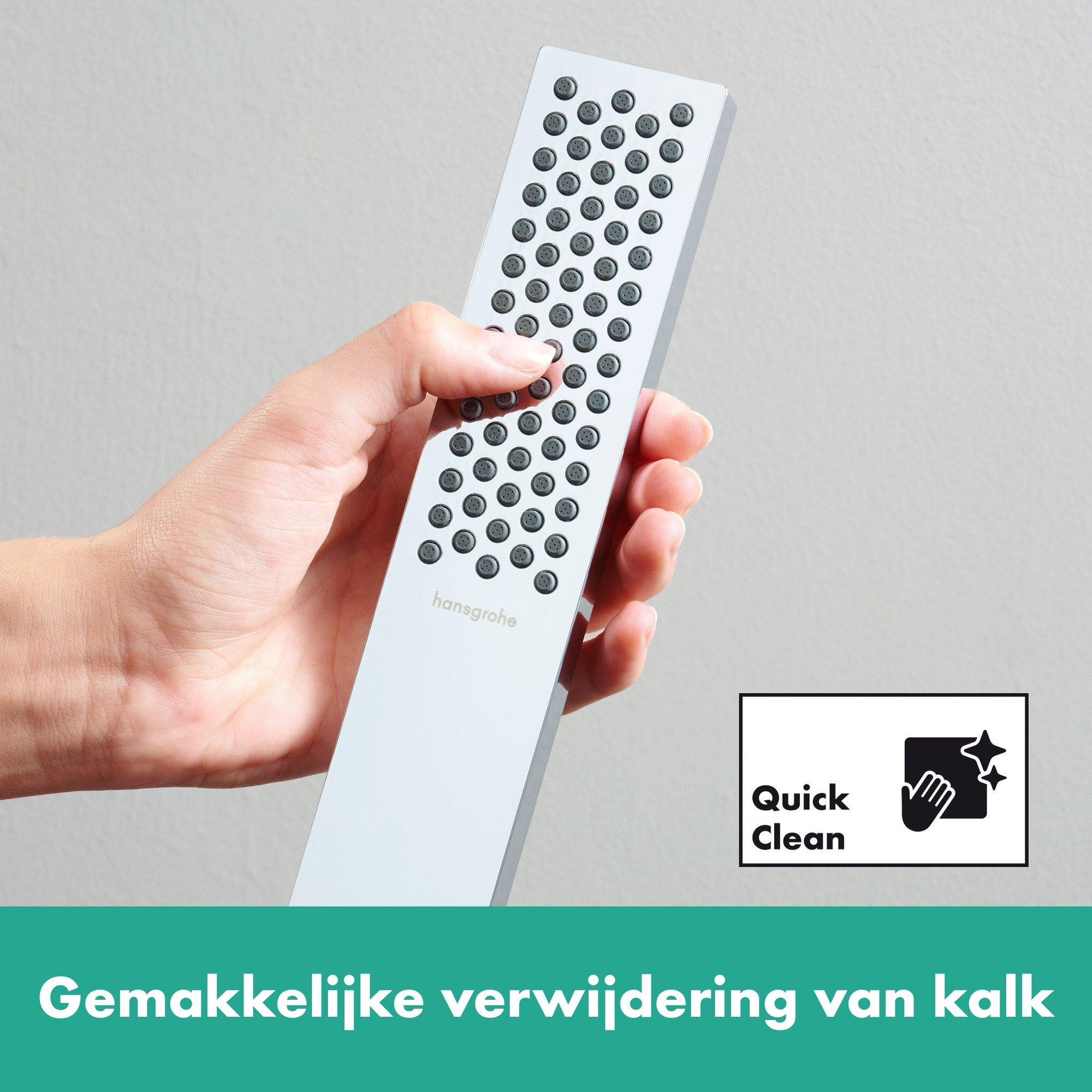 Deze set is ontworpen met oog voor gebruiksgemak en comfort. De glijstang van 65 cm is eenvoudig met één hand verstelbaar dankzij de zelfvergrendelende douchehouder. De 1,60 meter lange doucheslang blijft dankzij een speciale houder altijd soepel en verdraait niet, wat zorgt voor een zorgeloze douchebeleving. Bovendien is de douchekop voorzien van een uitspoelbare zeef die vuil tegenhoudt en een QuickClean functie waarmee kalk eenvoudig te verwijderen is door over de siliconen noppen te wrijven. Zo blijft je douchekop altijd in topconditie en geniet je langdurig van optimale prestaties.
