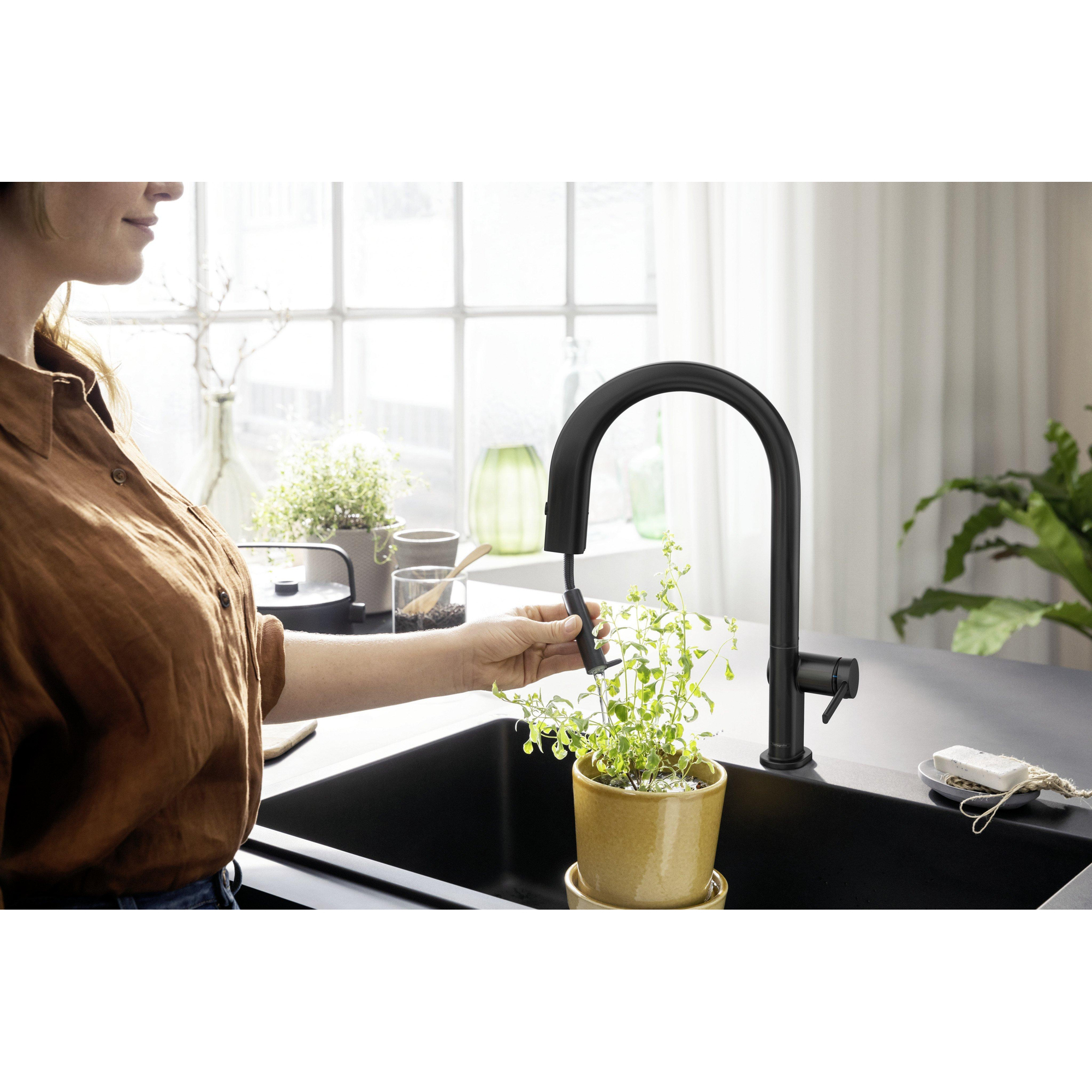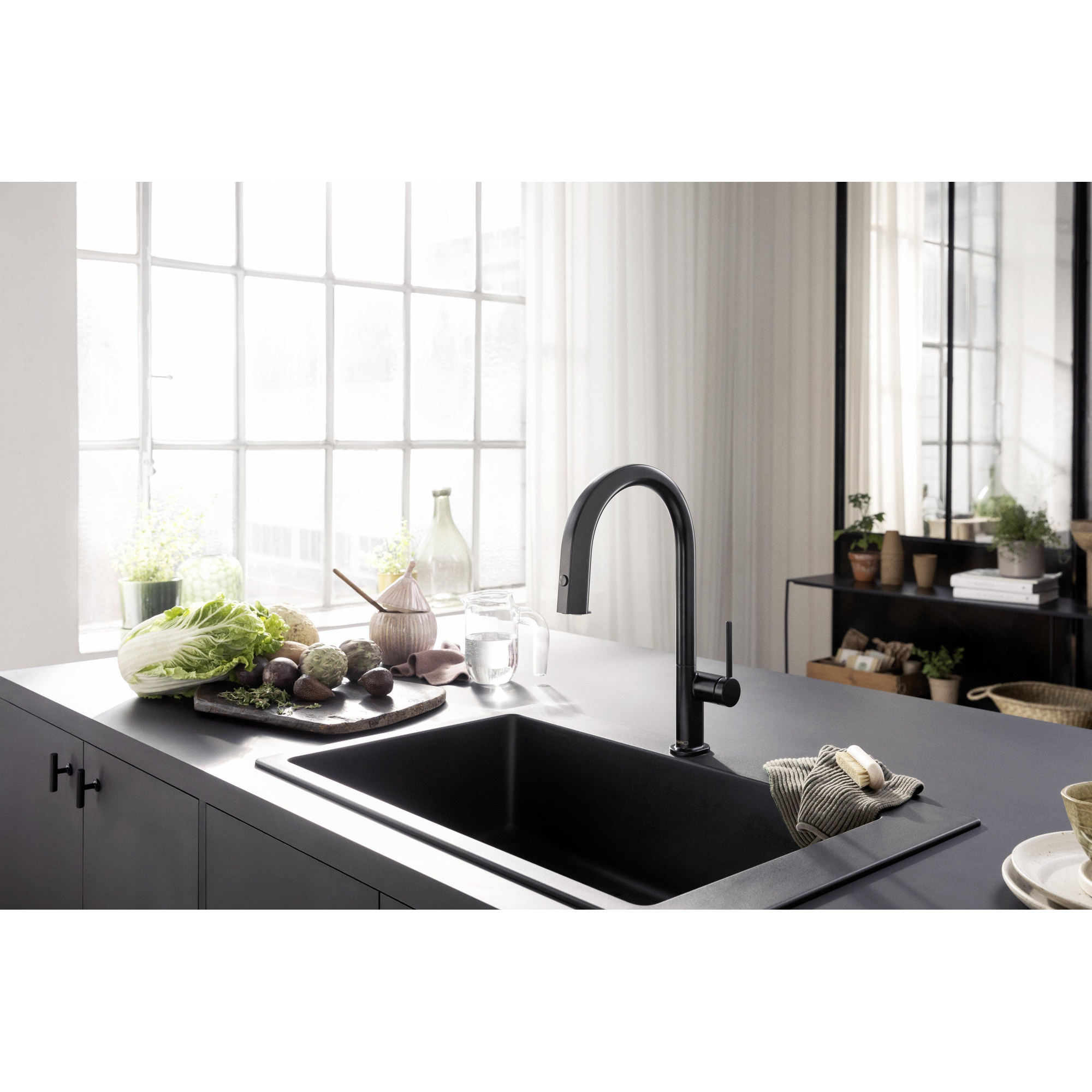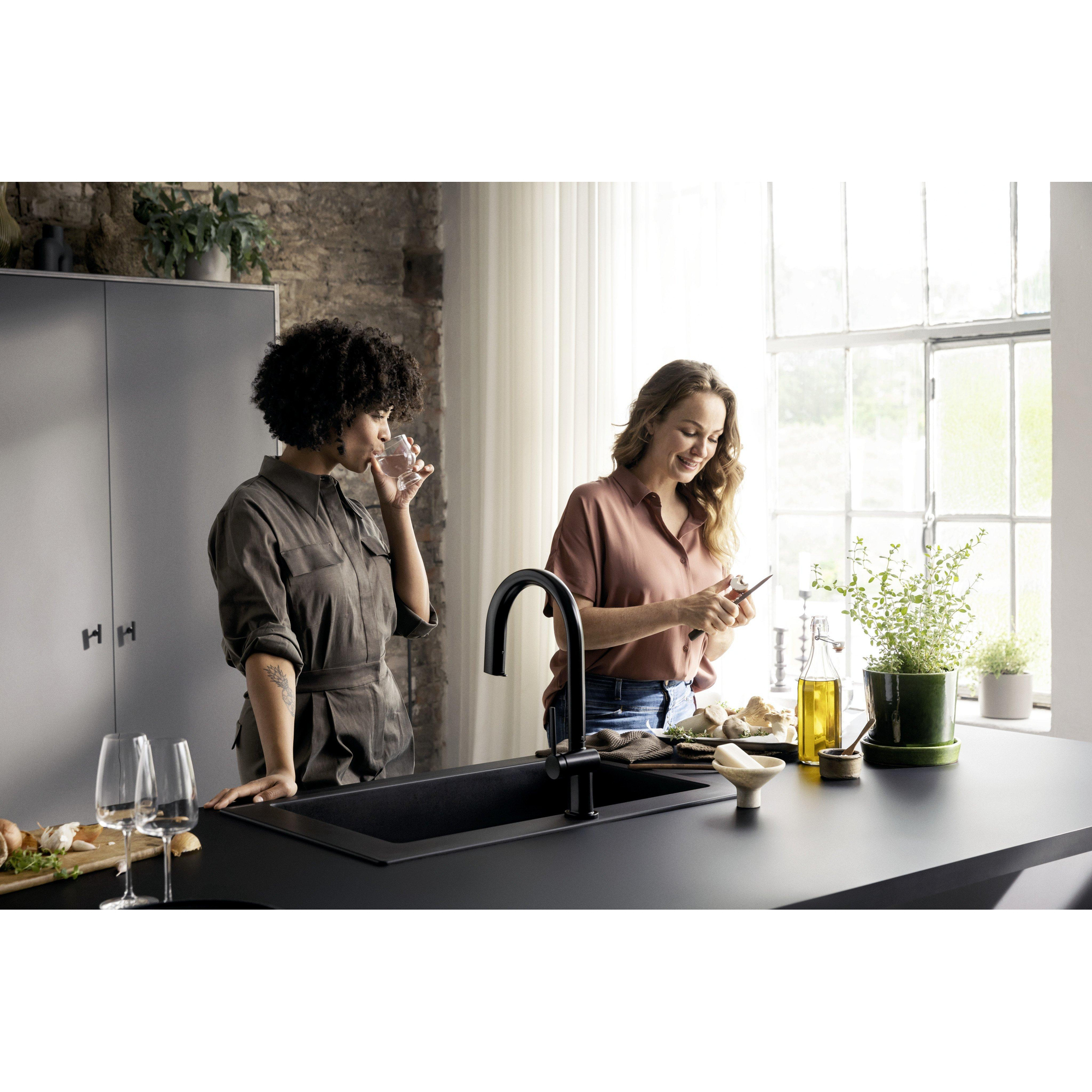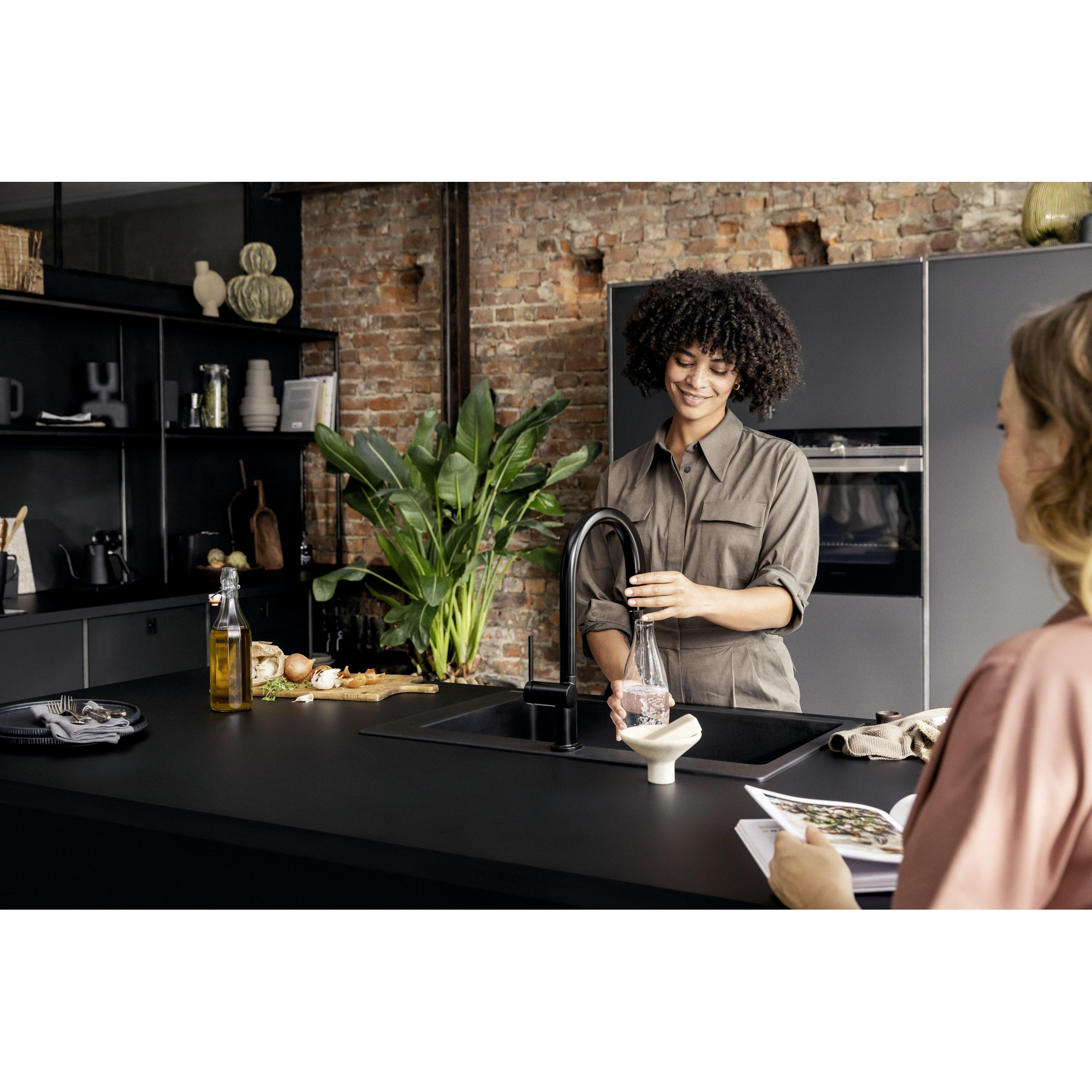 De matzwarte afwerking geeft deze kraan een eigentijdse en luxe uitstraling die direct opvalt. Het strakke design past perfect in moderne keukens en voegt een verfijnde touch toe zonder te overheersen. Door de subtiele kleur en het minimalistische silhouet wordt de kraan een echte blikvanger die je keuken een upgrade geeft. Bovendien zorgt het hoogwaardige materiaal ervoor dat de kleur langdurig mooi blijft, zelfs bij intensief gebruik. Zo geniet je niet alleen van een functioneel product, maar ook van een stijlvol element dat je keuken compleet maakt.