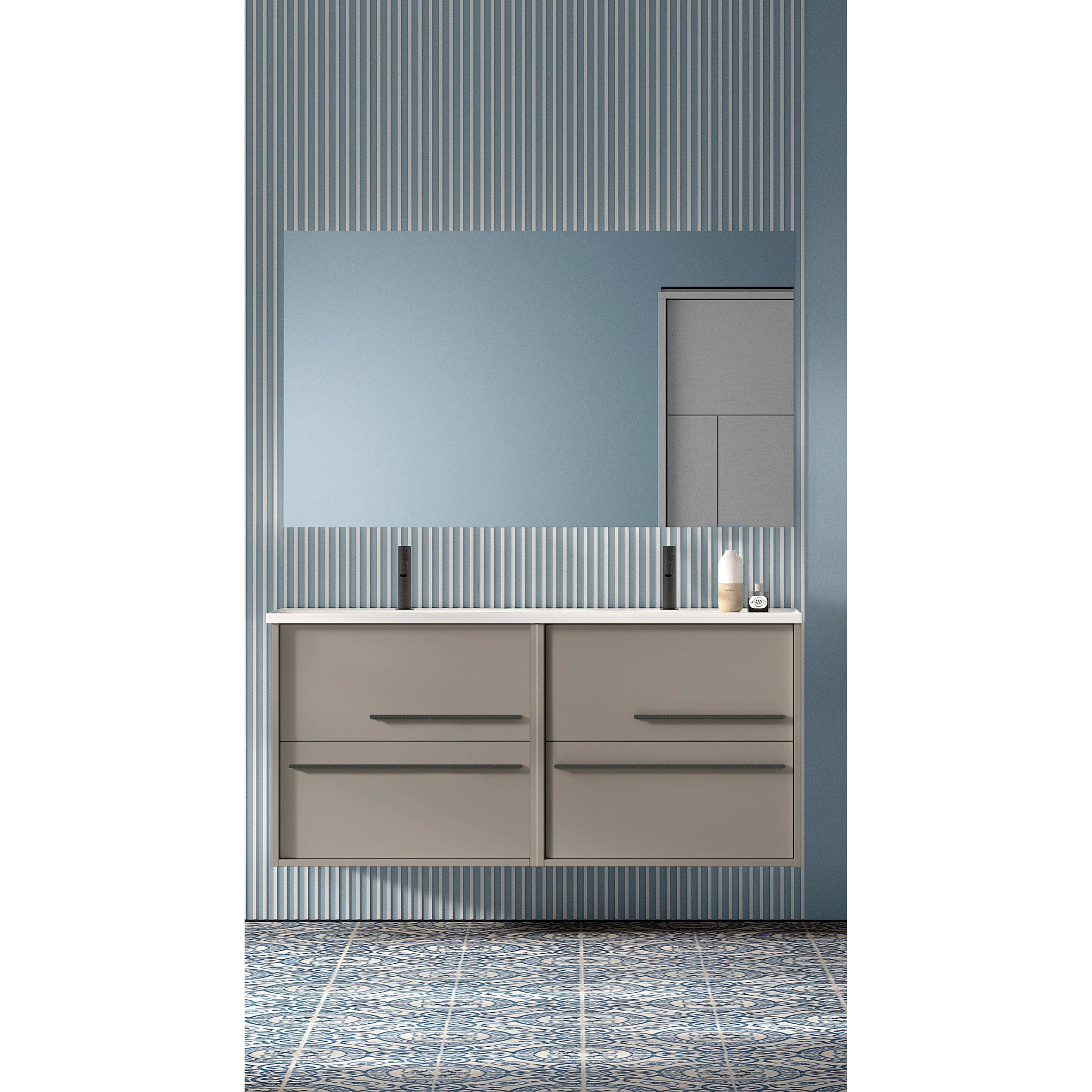 Met zijn strakke lijnen en zachte taupekleur voegt deze set een subtiele elegantie toe aan elke badkamer. De ovale witte wasbakken contrasteren prachtig met het matte meubeloppervlak, wat zorgt voor een moderne en frisse uitstraling. Dit meubel past moeiteloos in uiteenlopende interieurstijlen, van minimalistisch tot klassiek, en geeft jouw badkamer een luxe uitstraling zonder te overheersen. De rechthoekige spiegel maakt het geheel compleet en zorgt voor een ruimtelijk effect, waardoor je badkamer groter en lichter aanvoelt. Zo creëer je een stijlvolle ambiance die uitnodigt tot ontspanning en verzorging.