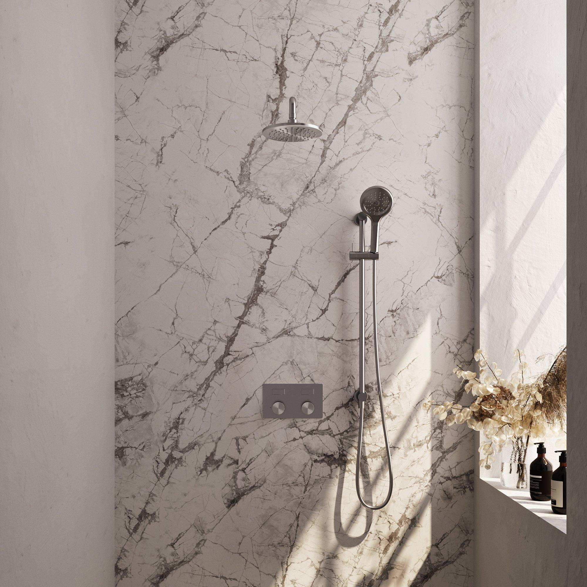De BRAUER Brushed Carving Thermostatische Regendouche inbouw straalt elegantie en stijl uit. De geborsteld roestvrijstalen afwerking geeft een moderne uitstraling aan de badkamer en past perfect bij verschillende interieurstijlen. Het ontwerp met drukknoppen zorgt voor een moeiteloze bediening en voegt een vleugje luxe toe aan je dagelijkse douche-ervaring.