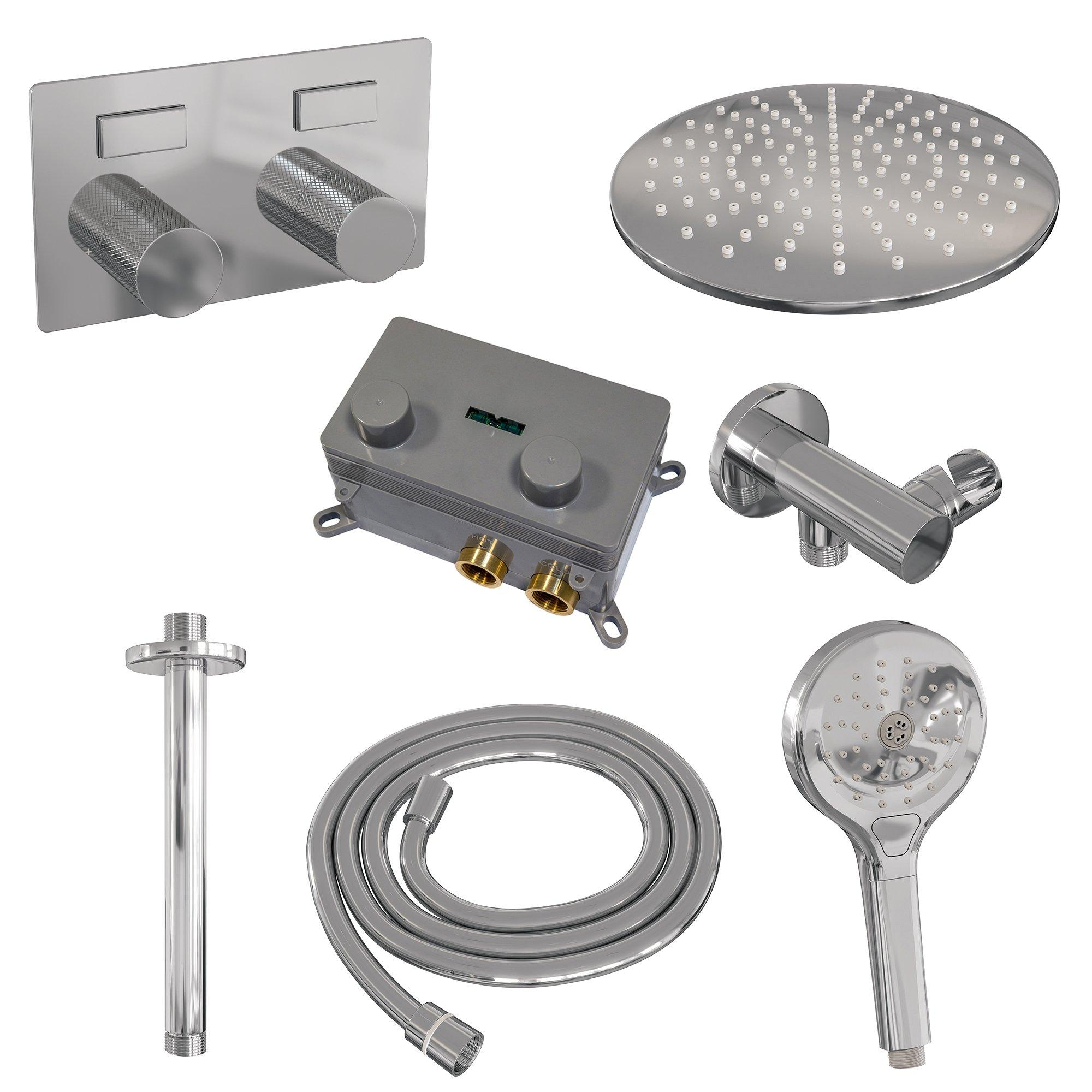 BRAUER Chrome Carving Thermostatische Regendouche inbouw - drukknoppen - SET 60 - 30cm hoofddouche - plafondarm - 3 standen handdouche - doucheslang - wandaansluitbocht - chroom