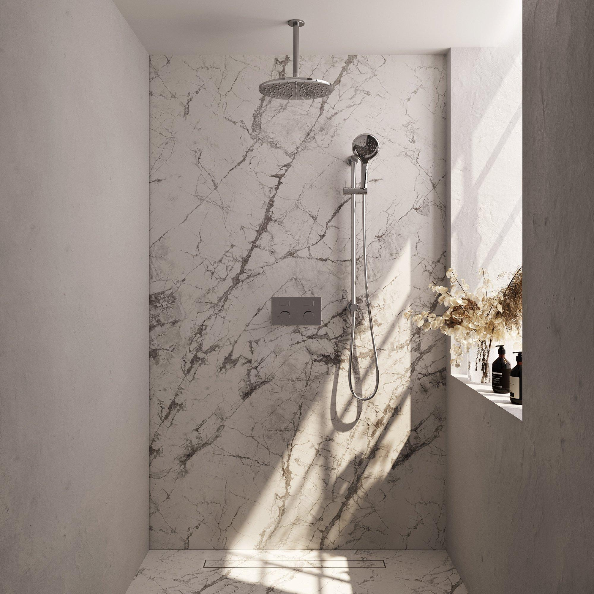 Deze regendouche is niet alleen functioneel maar ook stijlvol. De strakke lijnen en het eigentijdse ontwerp passen perfect bij een moderne badkamerinrichting. De geïntegreerde glijstang en de 30cm hoofddouche voegen een vleugje luxe toe aan de ruimte, terwijl de drukknoppen en 3 standen handdouche zorgen voor ultiem comfort.
